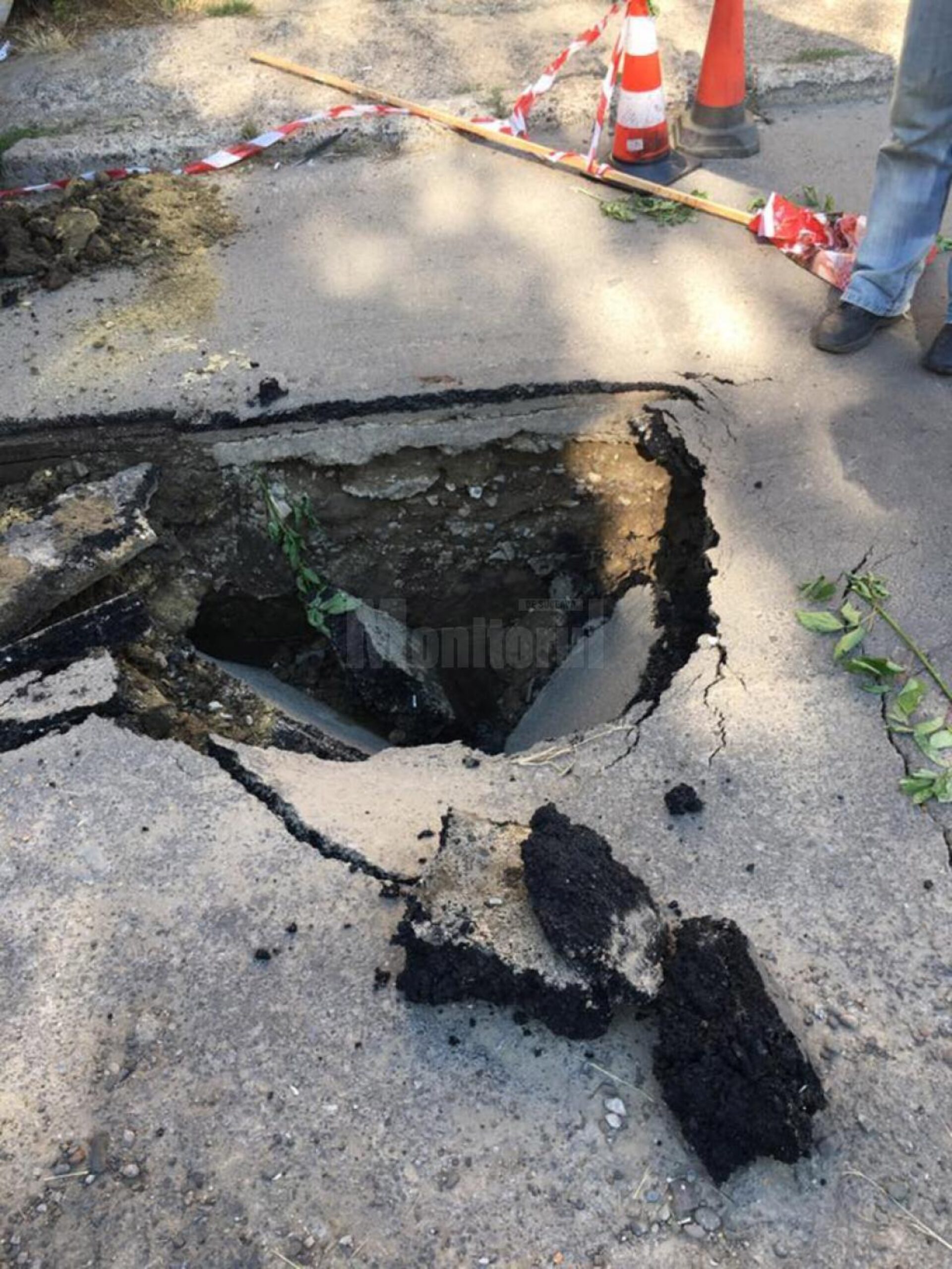 Mai grav, sâmbătă, o mașină era să cadă într-o groapă căscată în asfalt pe strada Oituz, acolo unde una dintre conductele noi montate de Pfeiffer a cedat.