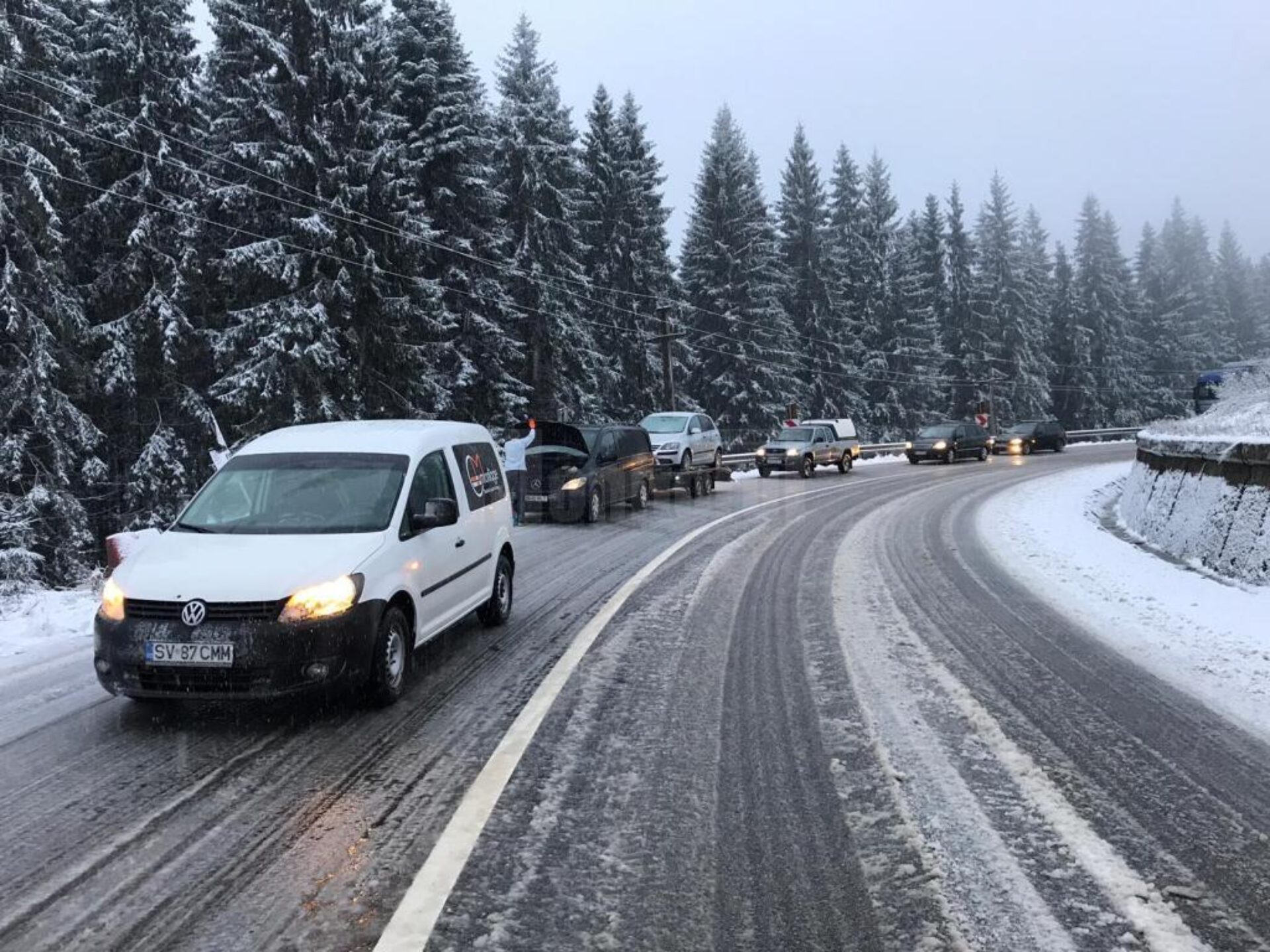 Carosabilul de pe DN 17, în Pasul Tihuța, zona de intrare în Suceava, este acoperit de strat subțire de zăpadă și cu strat de polei, cauză din care s-au format blocaje în trafic, pe aproximativ un kilometru. Drumarii de la Direcția Regională de Drumuri și Poduri Iași sunt pe traseu. Probleme sunt cu destul de multe mașini care nu sunt echipate pentru deplasarea în condiții de iarnă.