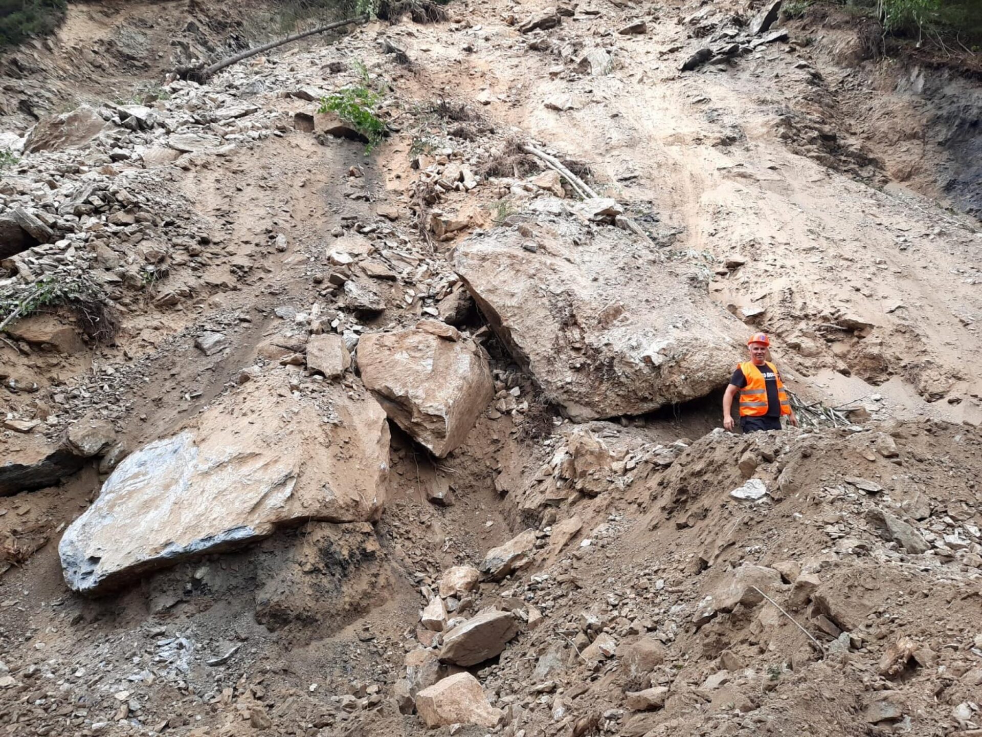 Traficul rutier de pe DN 17B, sectorul Broșteni-Vatra Dornei, este în continuare oficial închis. Deși partea carosabilă a fost curățată, căderile de pe versantul care a luat-o la vale în zona localității Holda-Broșteni continuă. Nu este vorba de căderi mari, însă mai îngrijorător este că pe versant, deasupra șoselei practic, sunt blocuri de piatră imense, parțial desprinse de versant. După cum se vede și în fotografia atașată la material, este vorba de blocuri de piatră de mari dimensiuni, care ar putea provoca o tragedie de proporții, în cazul în care traficul s-ar relua în condiții normale. Specialiștii de la Drumuri Naționale spun că, având în vedere dimensiunile blocurilor de piatră, de peste 4 metri, acestea au câte 45-50 de tone.