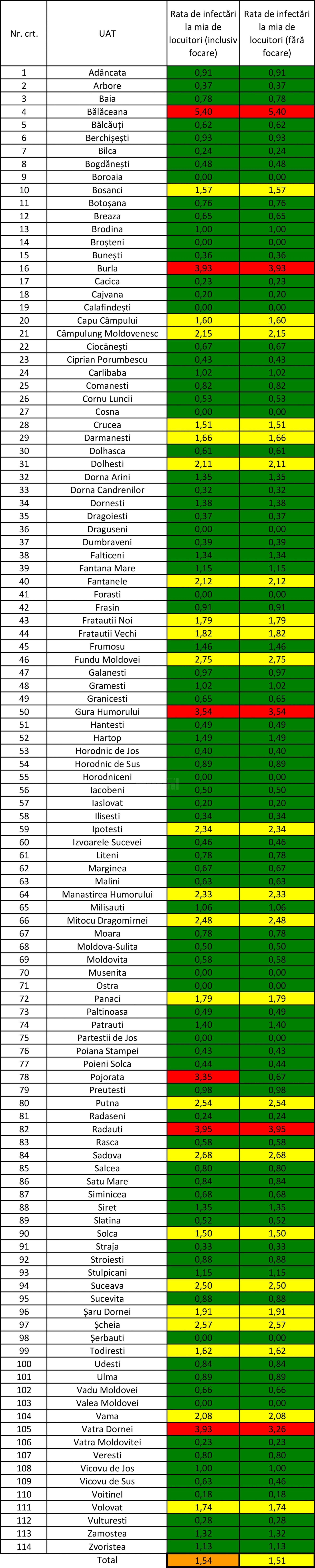 În zona roșie, cu incidență a cazurilor pozitive de peste 3 la mia de locuitori sunt Rădăuți, Vatra Dornei, Gura Humorului și comunele Bălăceana, Burla și Pojorâta (cu focare). În zona galbenă, cu incidență între 1,5 și 3 la mie, sunt 23 de localități, inclusiv municipiul Suceava, unde incidența este de 2,5 la mie. Celelalte localități sunt în zona verde, cu incidență sub 1,5 la mie.