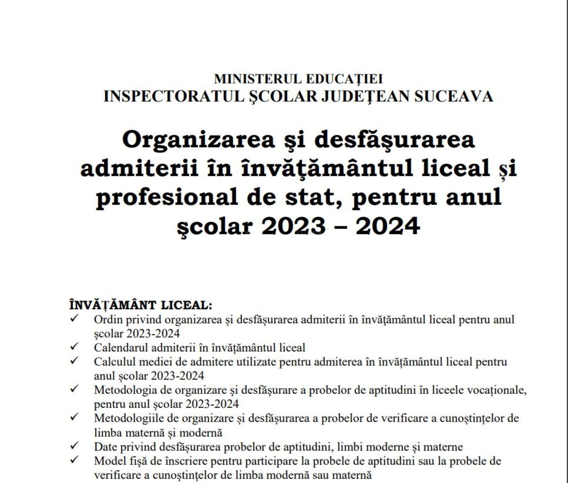 Elevii claselor a VIII-a pot consulta broșura de admitere la liceu, sesiunea 2023 – 2024, ghidul fiind publicat în format electronic pe pagina online a Inspectoratului Școlar Județean (IȘJ) Suceava.