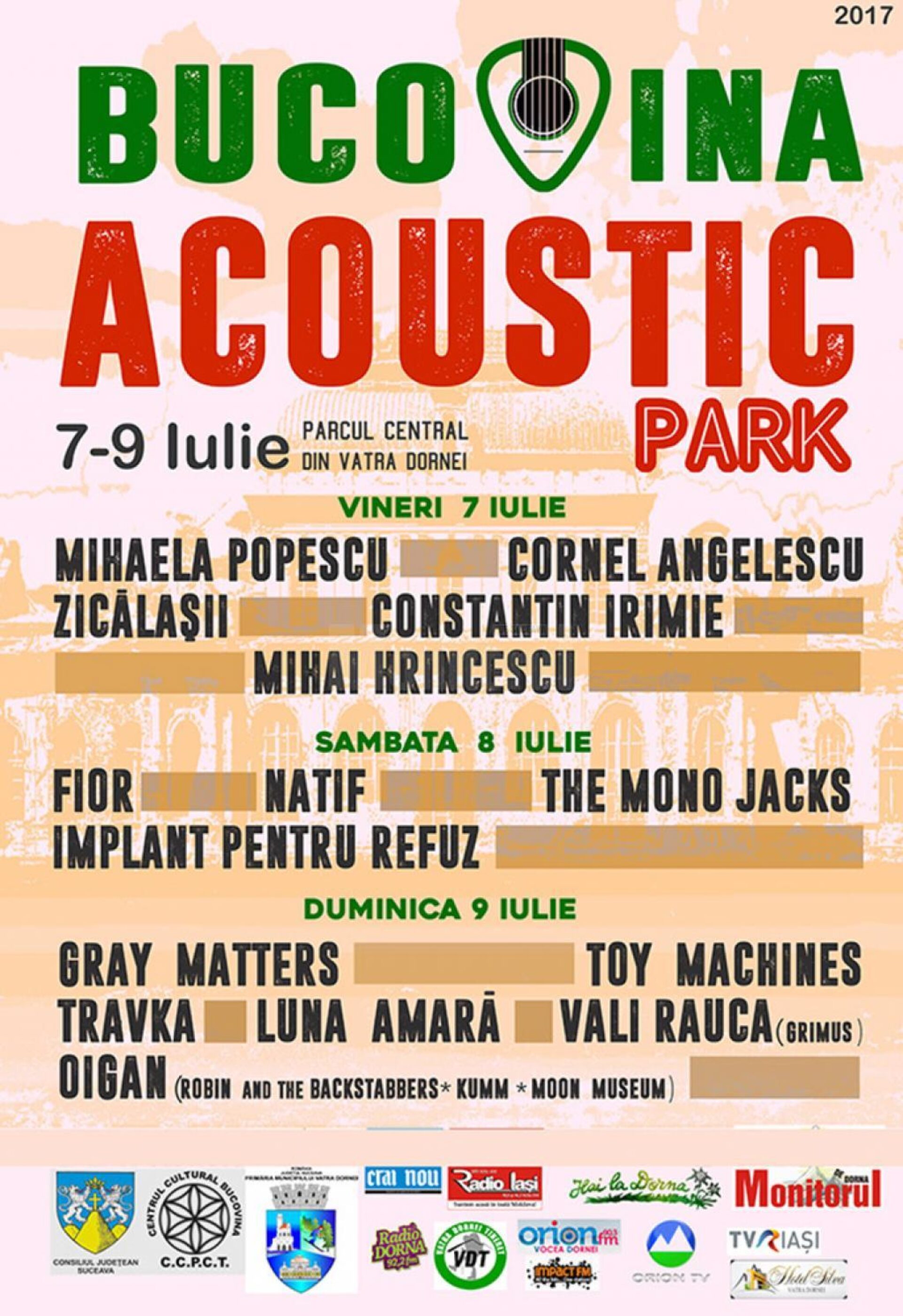 Consiliul Județean Suceava, Centrul Cultural „Bucovina”, Primăria municipiului Vatra Dornei și Casa de Cultură „Platon Pardău” Vatra Dornei organizează, în intervalul 7-9 iulie a.c., prima ediție a manifestării „Bucovina Acoustic Park”.