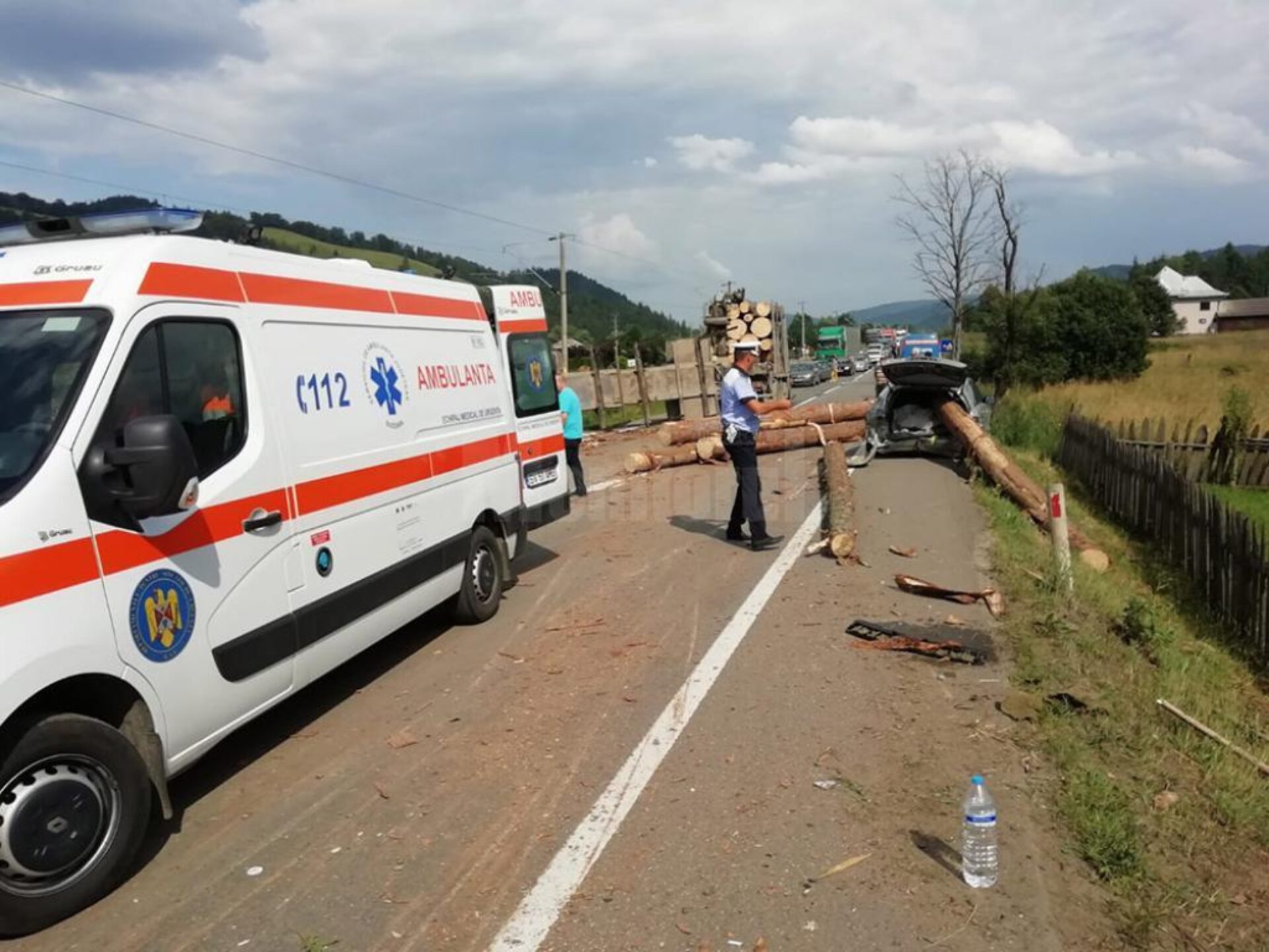 Grav accident în după-amiaza zilei de sâmbătă pe drumul european care leagă Moldova și Ardeal. Mai mulți bușteni care se aflau în remorca unui camion au zburat pe carosabil și au rănit trei persoane, printre acestea fiind și un copil de numai 10 ani. Accidentul s-a produs între Molid și Frasin și doar norocul a făcut ca lucrurile să nu fie și mai grave. Trunchiurile de lemn au intrat efectiv prin mașină ca un berbece, iar dacă vreo persoană ar fi avut ghinionul să fie în interior nu ar fi avut absolut nici o șansă de supraviețuire. Femeia în vârstă de 49 de ani și fiul acesteia, în vârstă de 10 ani, ambii din Iași, erau coborâți din autoturismul marca Mazda deoarece acesta prezenta o serie de probleme. Mașina era parcată în afara carosabilului, iar cei doi se aflau în jurul mașinii. Femeia a suferit răni grave fiind diagnosticată la Spitalul din Gura Humorului, acolo unde a fost transportată inițial, cu „contuzie toraco-abdominală și fractură bazin”. Fiul acesteia a scăpat mult mai ușor, fiind diagnosticat cu „contuzie toraco- abdominală”. În afara minorului și a mamei sale, la spital a ajuns și un bărbat de 52 de ani, din județul Buzău, care, de asemenea a fost rănit. Reprezentanții ISU Suceava au trimis la fața locului o autospecială cu accesorii pentru descarcerare și o ambulanță SMURD, iar în sprijinul acestora au mers trei echipaje de la Serviciul de Ambulanță Județean. Polițiștii verifică acum dacă șoferul în vârstă de 24 de ani, Niculae Antime, avea toate avizele necesare pentru transportul celor aproape 30 mc de material lemnos, precum și dacă autocamionul marca MAN și remorca erau omologate și aveau toate verificările tehnice la zi. Din primele date ale anchetei reiese că vinovat de producerea accidentului este șoferul camionului care a intrat cu viteză prea mare într-o curbă deosebit de periculoasă și nu a mai putut controla vehiculul, remorca acestuia răsturnându-se.