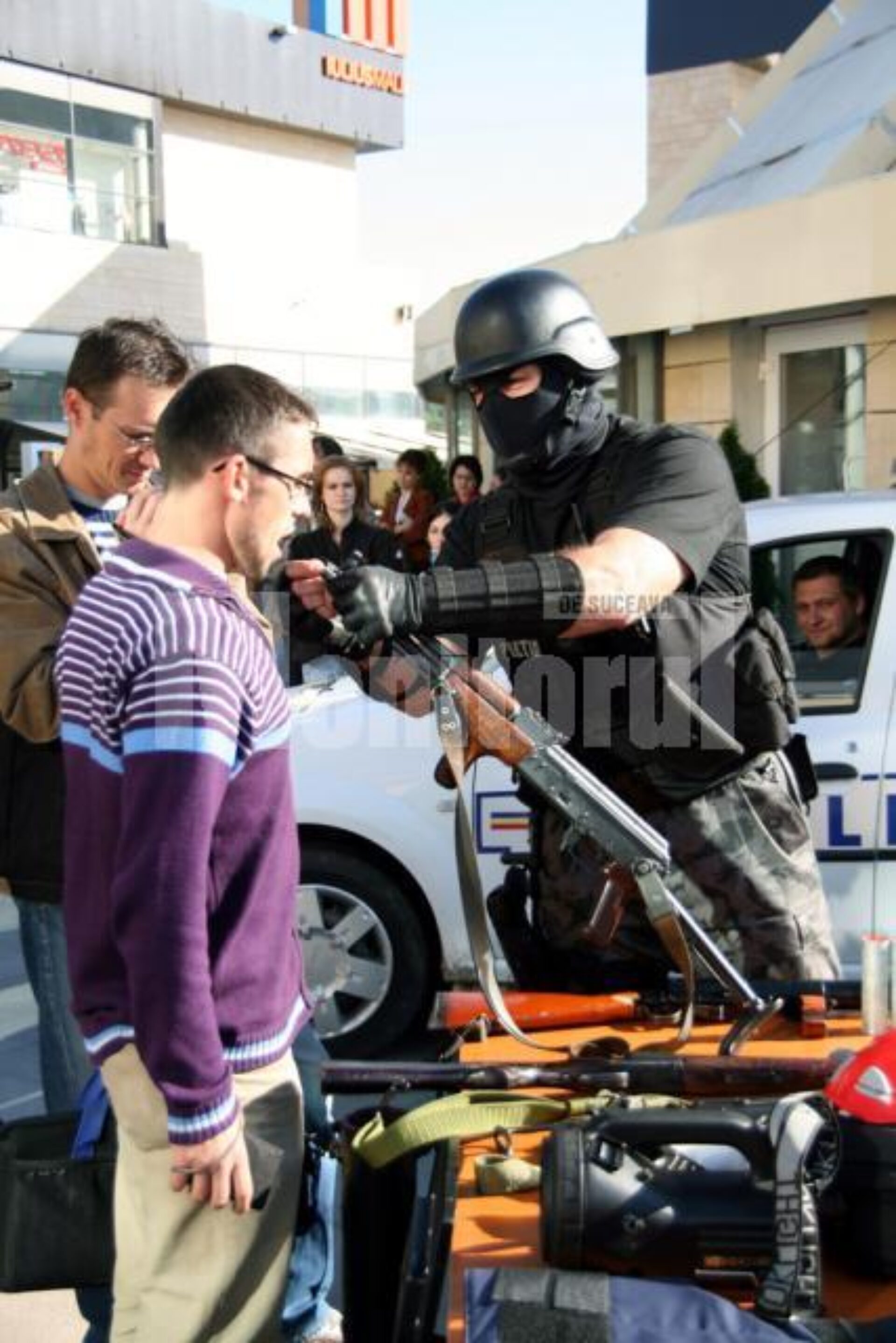 Zeci de adulți și copii au luat parte, ieri după-amiază, în parcarea Iulius Mall Suceava, la acțiunea de prezentare a armamentului și tehnicii de luptă a forțelor de poliție și jandarmerie, vedetele expoziției de la intrarea în mall fiind așa-zișii „mascați”, luptători din cadrul structurilor de intervenție rapidă, precum și câinii de urmă și patrulare ai oamenilor legii.