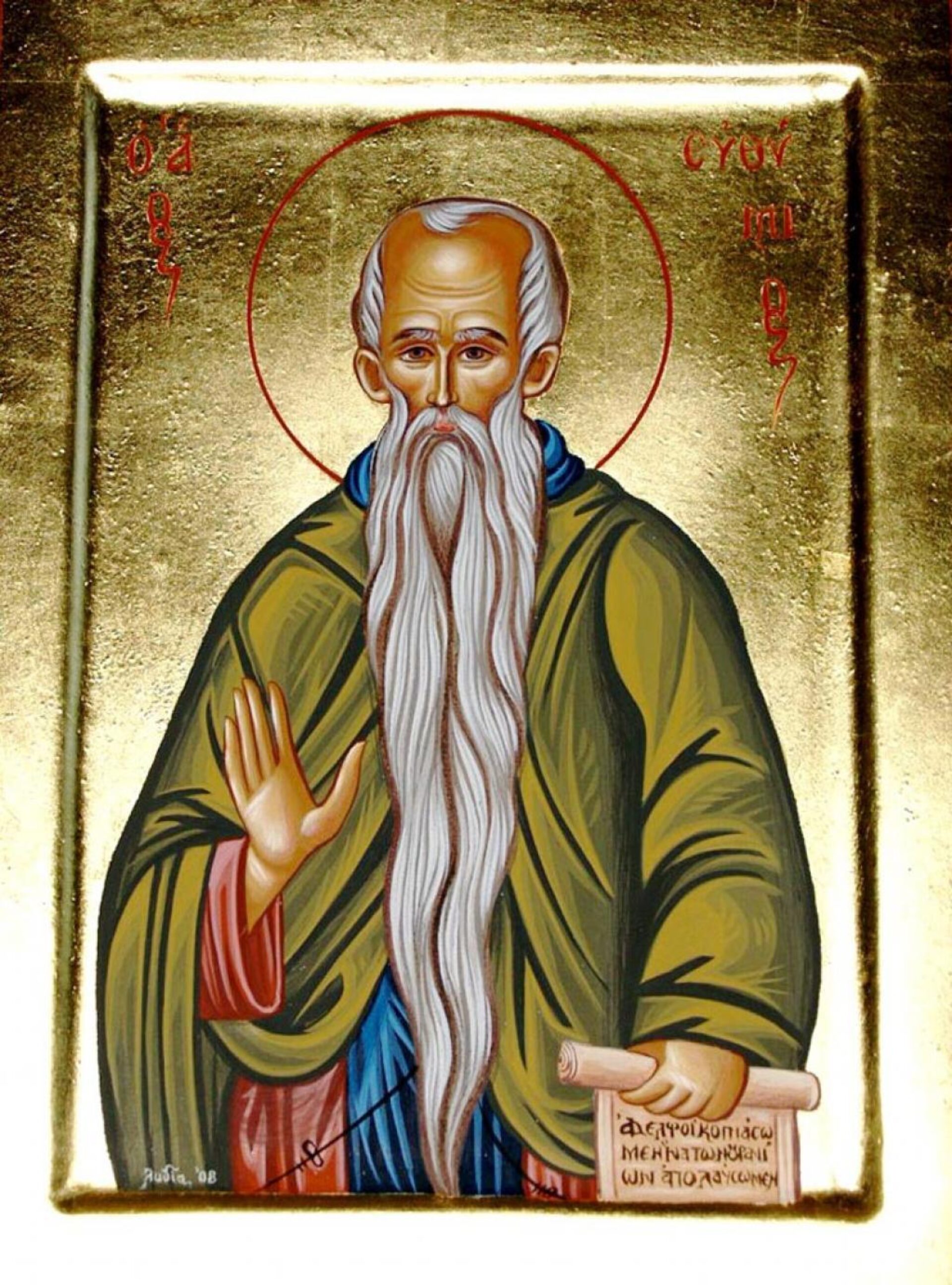 Sfântul Cuvios Eftimie († 473) a trăit pe vremea împăratului Teodosie cel Mare (379-395), ajungând până în zilele împăratului Leon I (457-474). Fiind de 29 de ani, s-a dus la Ierusalim și a rămas într-o mănăstire numită Fara, unde l-a cunoscut pe Cuviosul Teoctist. După cinci ani a ieșit din Mănăstirea Fara și s-a sălășluit într-o peșteră din râpa unui munte din pustie, către Iordan. Pentru nevoințele sale, marele Eftimie a primit de la Dumnezeu darul facerii de minuni și al prorociei. A fost descoperit de niște păstori și multă lume a început să vină la el. Cuviosul Eftimie era cunoscut și cinstit de cei trei mari îndrumători ai vieții pustnicești din vremea lui: Sfântul Simeon Stâlpnicul, Fericitul Sava cel Sfințit și Sfântul Teodosie – toți patru apărau dreapta credință statornicită la Sinodul al 4-lea Ecumenic de la Calcedon din anul 451. Sfântul Eftimie a prorocit că doi dintre ucenicii săi, Ilie (494-516) și Macarie (544-554, 564-574), vor fi patriarhi ai Ierusalimului, lucru care s-a întâmplat întocmai. La vârsta de 97 de ani s-a mutat în pace la Domnul.
