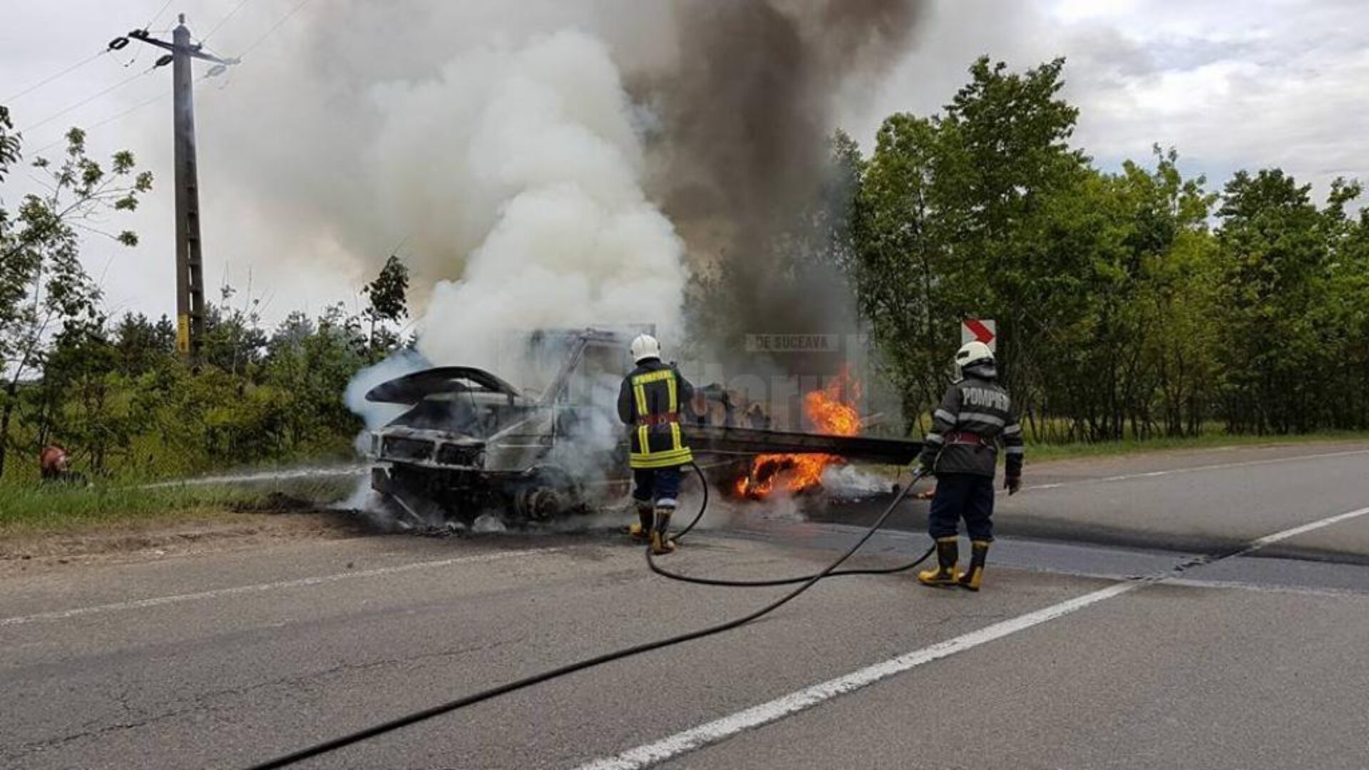 Militarii Detașamentului de Pompieri Suceava au intervenit sâmbătă după-amiază pentru localizarea și lichidarea unui incendiu izbucnit la o camionetă încărcată cu lemne, pe DN17, pe raza localității Ilișești.La sosirea echipajului, camioneta și încărcătura acesteia (aproximativ 5 metri cubi lemn de foc) ardeau în totalitate.„Cauza probabilă de izbucnire a incendiului a fost efectul termic al curentului electric, generat de un conductor electric defect”, se precizează în comunicatul pompierilor.