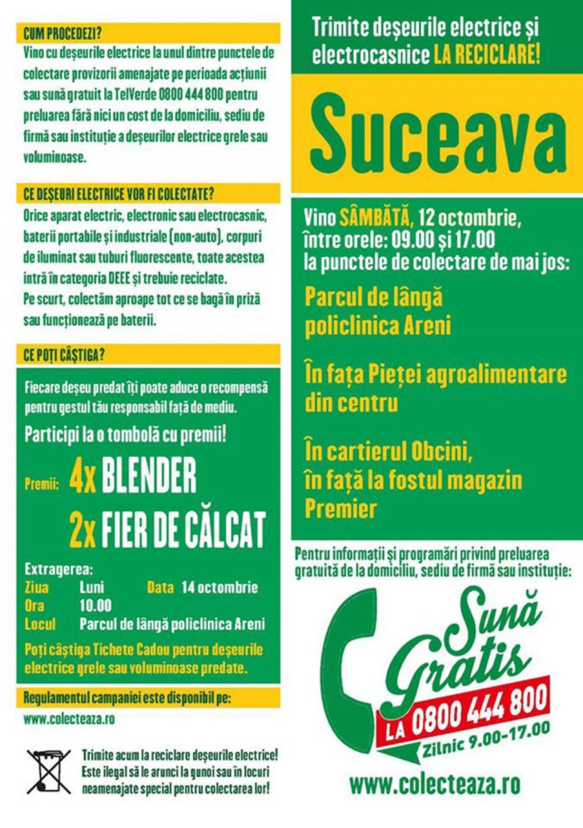 Primăria municipiului Suceava, în parteneriat cu Asociația Română pentru Reciclare ROREC, organizează sâmbătă, 12 octombrie, între orele 09:00 și 17:00, o nouă campanie de informare și colectare a deșeurilor de echipamente electrice și electronice.