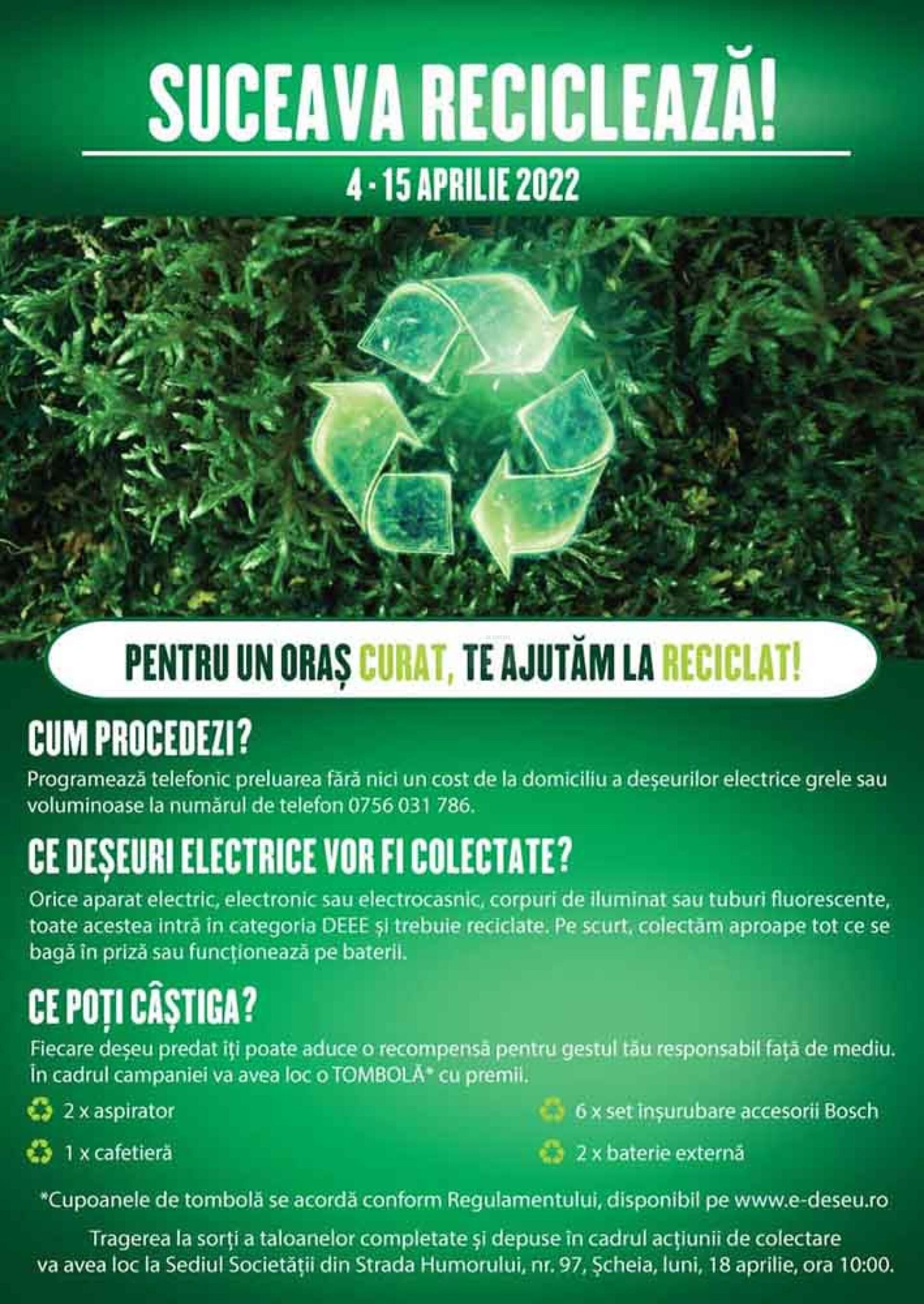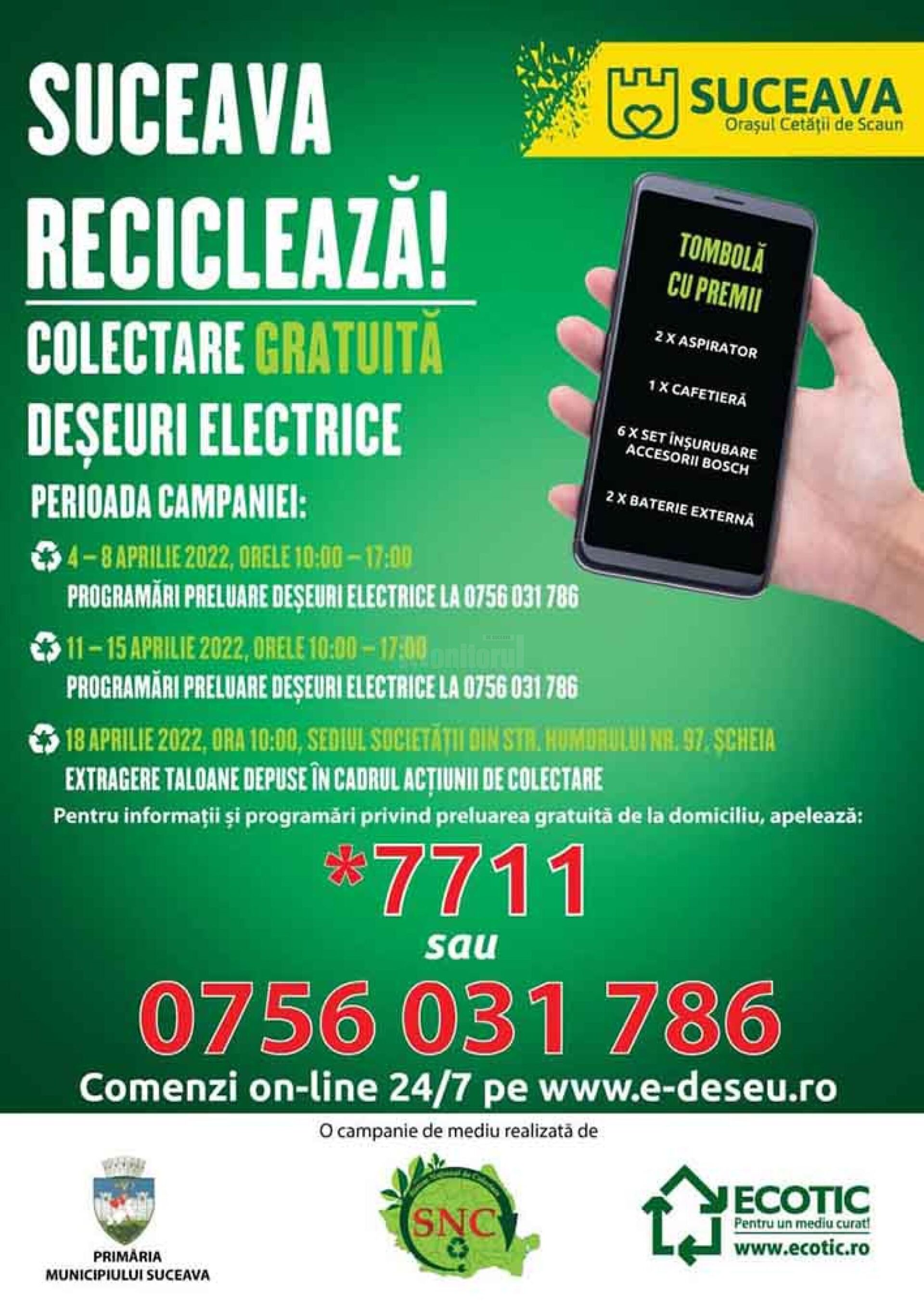 Pentru un oraș curat și un mediu mai sănătos, dar și pentru a conștientiza importanța reciclării, Primăria municipiului Suceava, împreună cu SNC (Sistem Național de Colectare), organizează campania de colectare gratuită a deșeurilor electrice, electronice și electrocasnice.