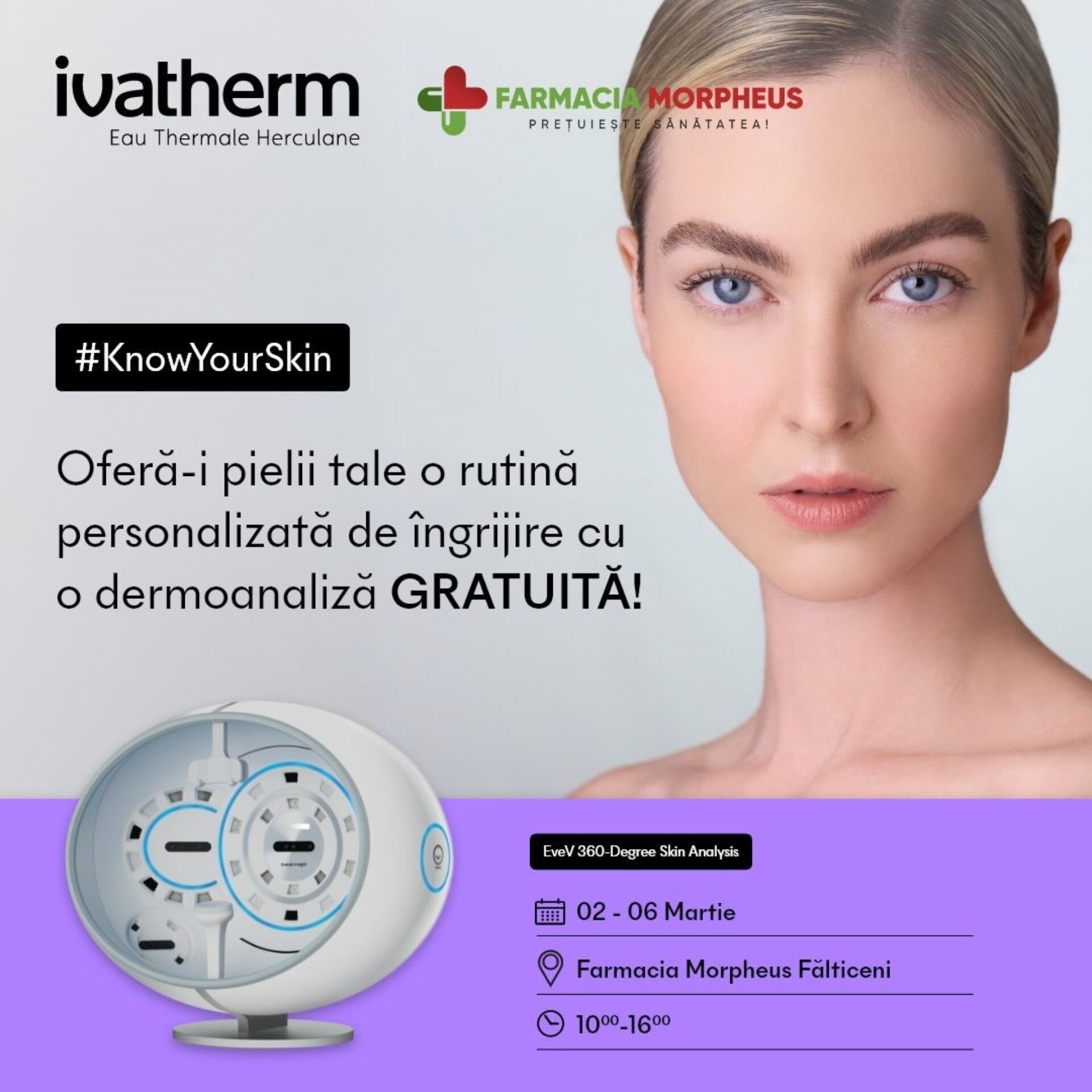 La Farmacia Morpheus din Fălticeni, în perioada 2-6 martie, îți oferim dermoanaliza tenului complet gratuită, realizată cu ajutorul aparatului EveLab Insight, în colaborare cu partenerii noștri, Ivatherm România.