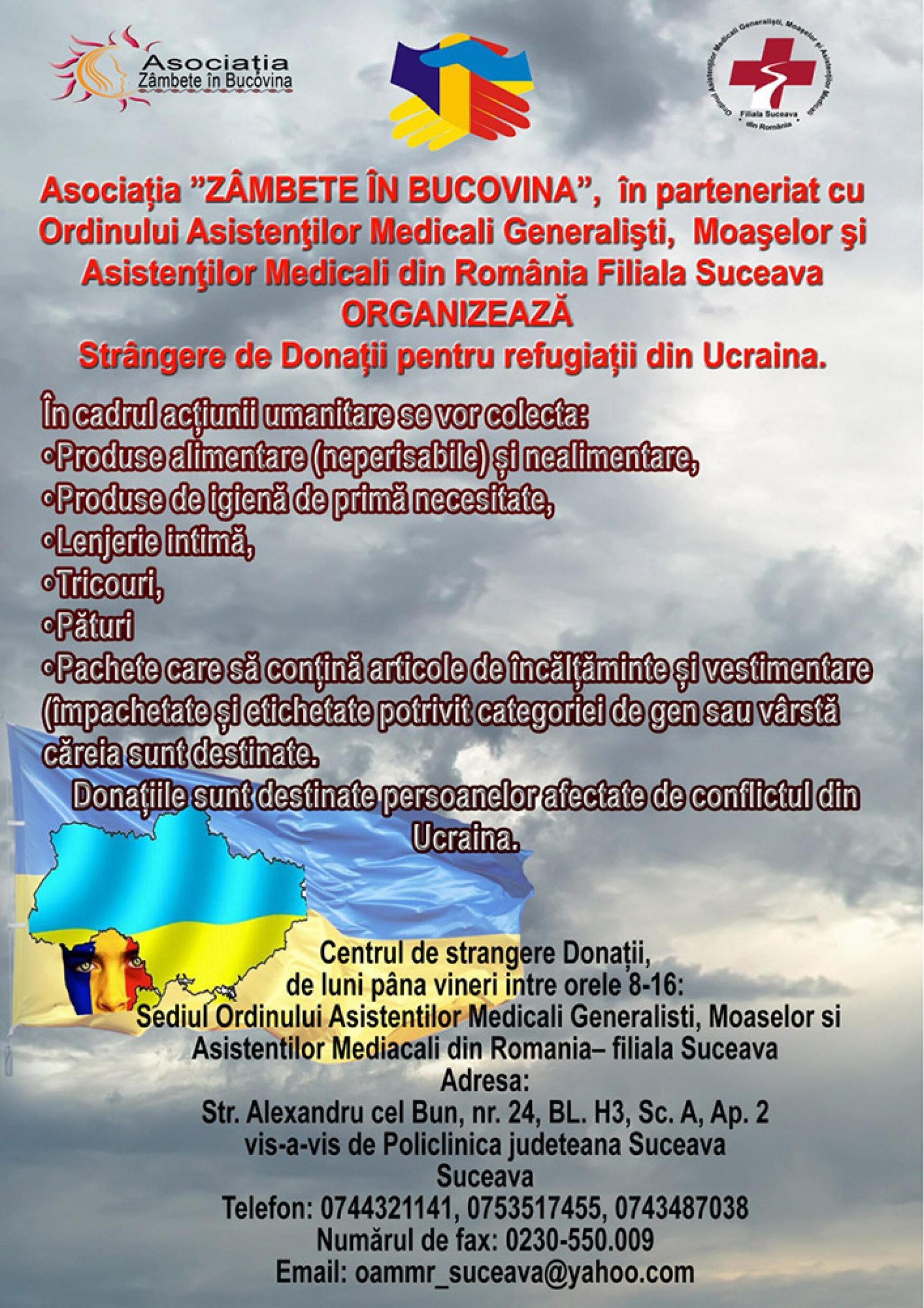 Asociația „Zâmbete în Bucovina”, în parteneriat cu Ordinul Asistenților Medicali Generaliști, Moașelor și Asistenților Medicali din România – Filiala Suceava, organizează o campanie de strângere donații pentru refugiații din Ucraina. În cadrul acțiunii umanitare se pot colecta: produse alimentare (neperisabile) și nealimentare, materiale sanitare, dezinfectante, consumabile medicale, produse de igienă, pături, pachete care să conțină articole de încălțăminte și vestimentare (împachetate și etichetate potrivit categoriei de gen sau vârstă căreia sunt destinate).