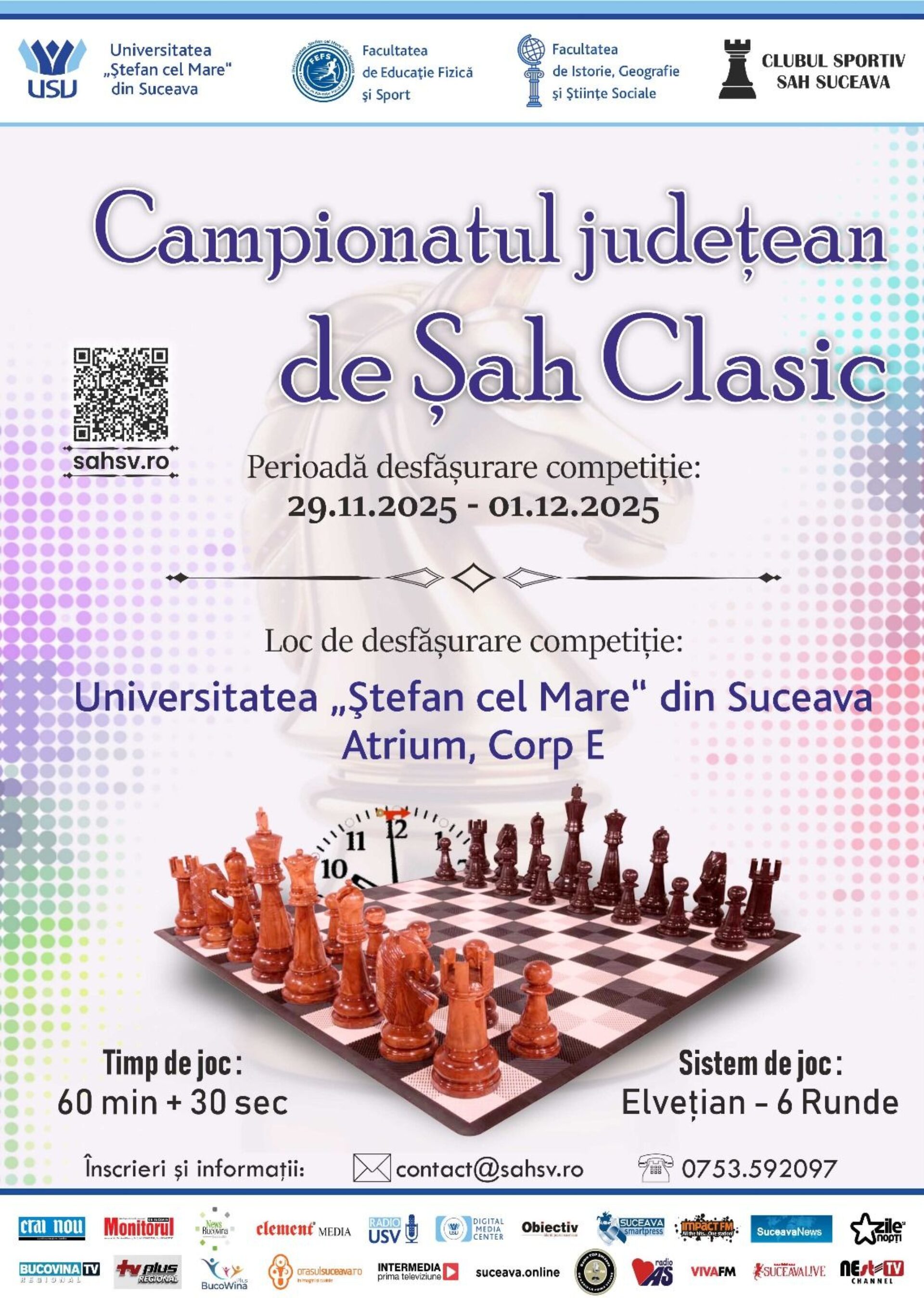 Universitatea „Ștefan cel Mare” din municipiul Suceava, împreună cu Club Sportiv „Șah” Suceava organizează, în perioada 29 noiembrie – 1 decembrie 2025, Campionatul județean de șah clasic. Concursul este omologat FR ȘAH și FIDE și se va desfășura la Universitatea „Ștefan cel Mare”, Atrium, Corp E.