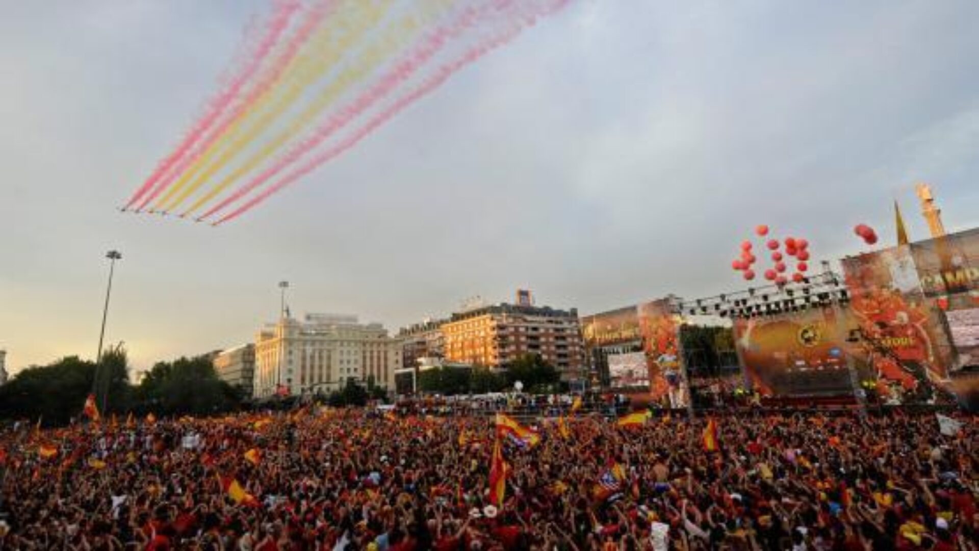 O mare de oameni în culoarea roșie, survolată de șapte avioane în culorile Spaniei, îi aștepta în piața Colon.