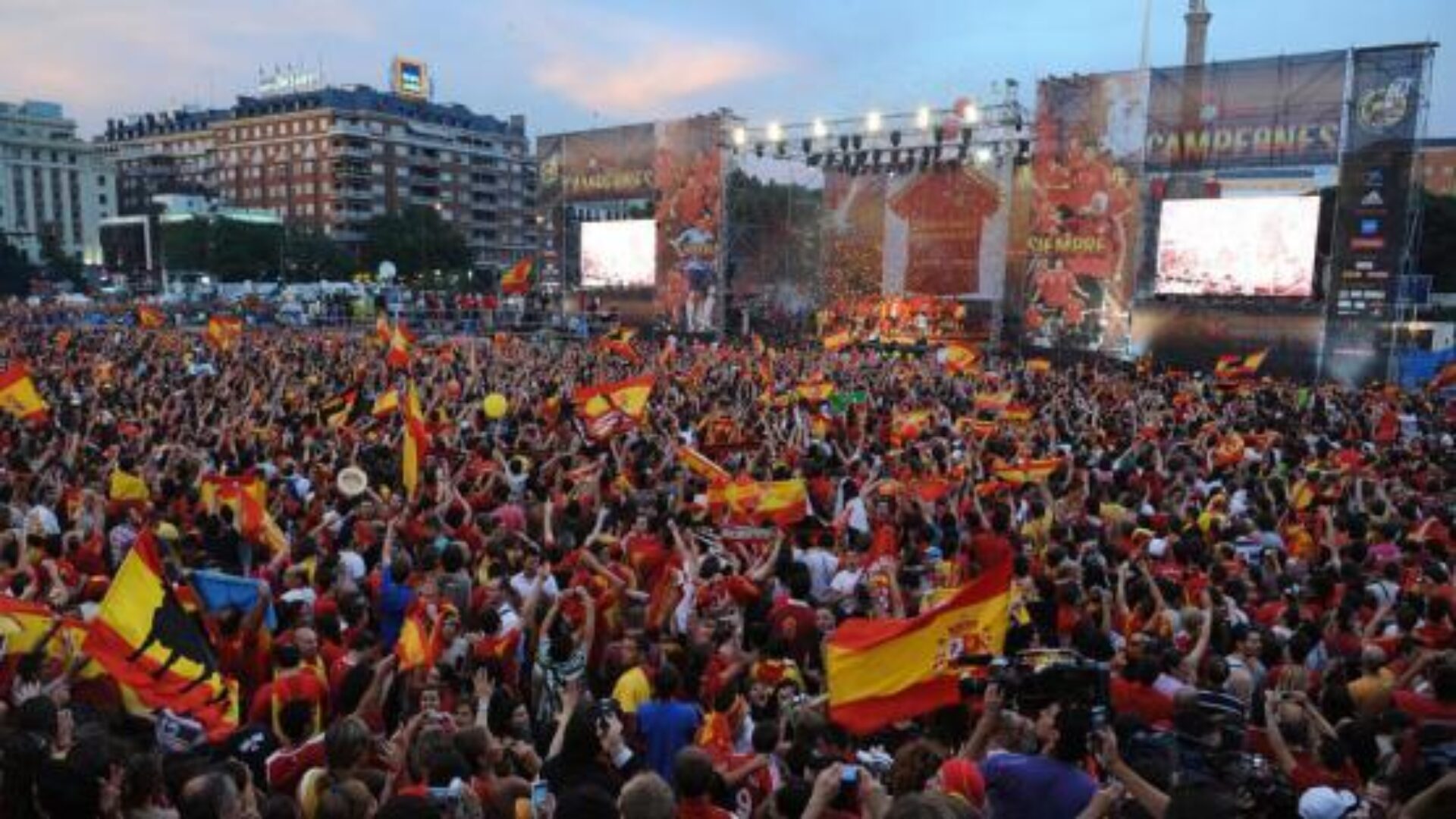 „Viva Espana!”, „Suntem campioni” au strigat sute de mii de oameni, în timp ce jucători precum Fernando Torres și Iker Casillas ridicau trofeul și dansau în autocar cu sticle de bere sau de suc în mâini.