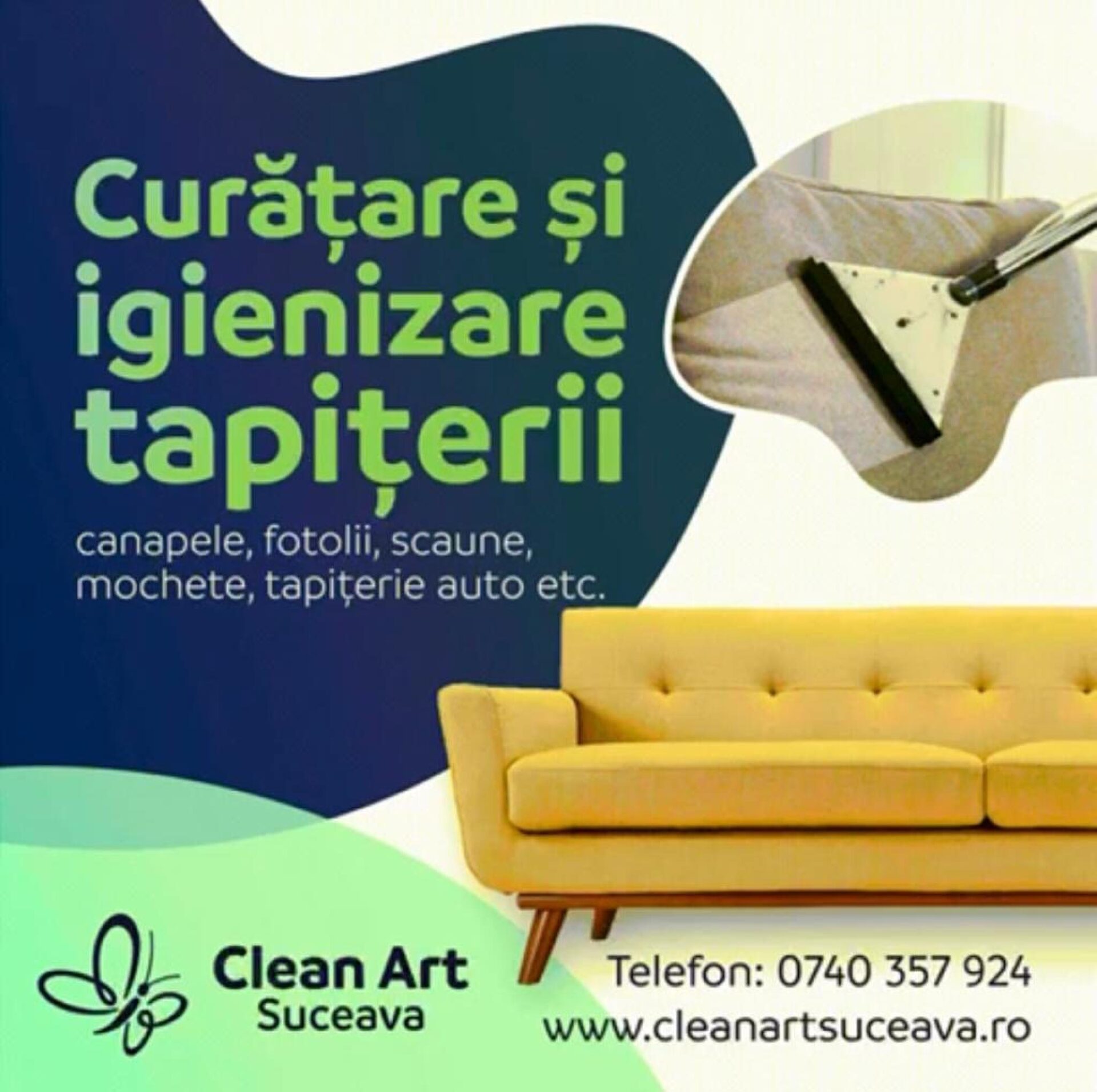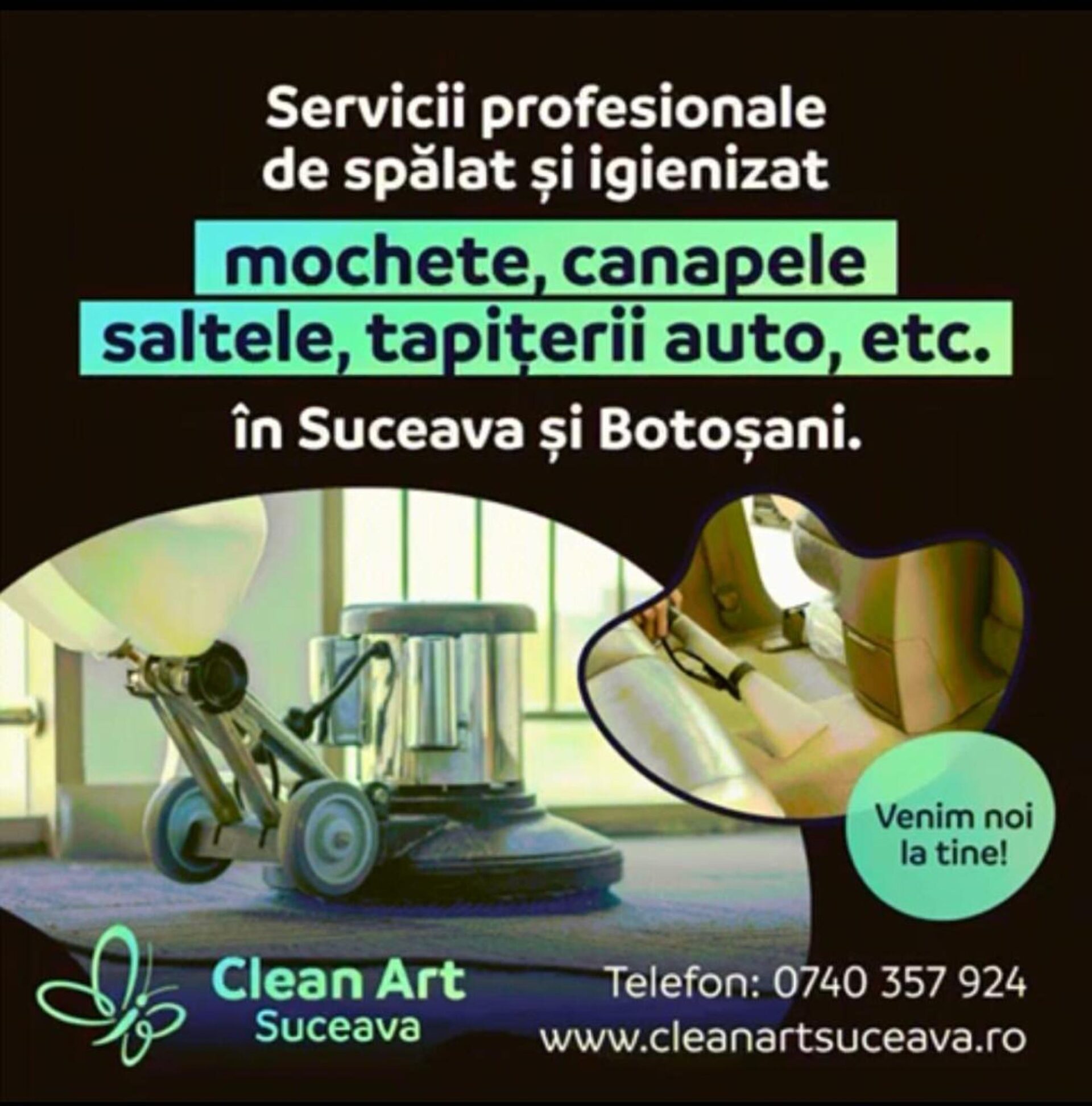 Sunt oferite servicii de curățare a mochetei și tapițeriei din locuințe, camere de hoteluri, pensiuni și restaurante, ozonizarea mașinilor prin eliminarea mirosurilor și purificarea instalației de aer condiționat, curățenie după constructori sau în urma unor amenajări interioare. Pentru toate aceste operațiuni sunt folosite cu pricepere aspiratoare cu injecție-extracție pentru spălat mocheta și tapițeria, aspiratoarele cu abur sau alte instrumente cu productivitate. Scopul lor este ca serviciile de curățenie oferite clienților să fie însoțite de seriozitate, responsabilitate și de încredere. Cei interesați pot obține informații la telefon 0740 357924 sau de pe site-ul firmei, www.cleanartsuceava.ro.
