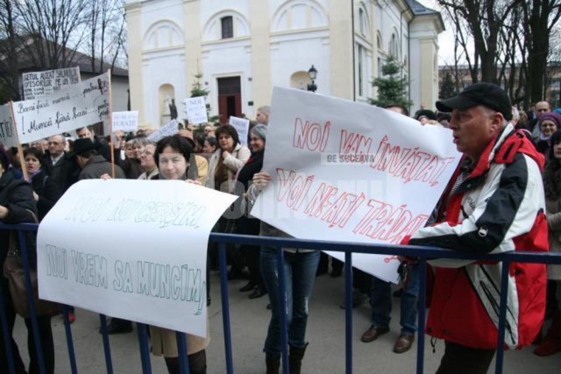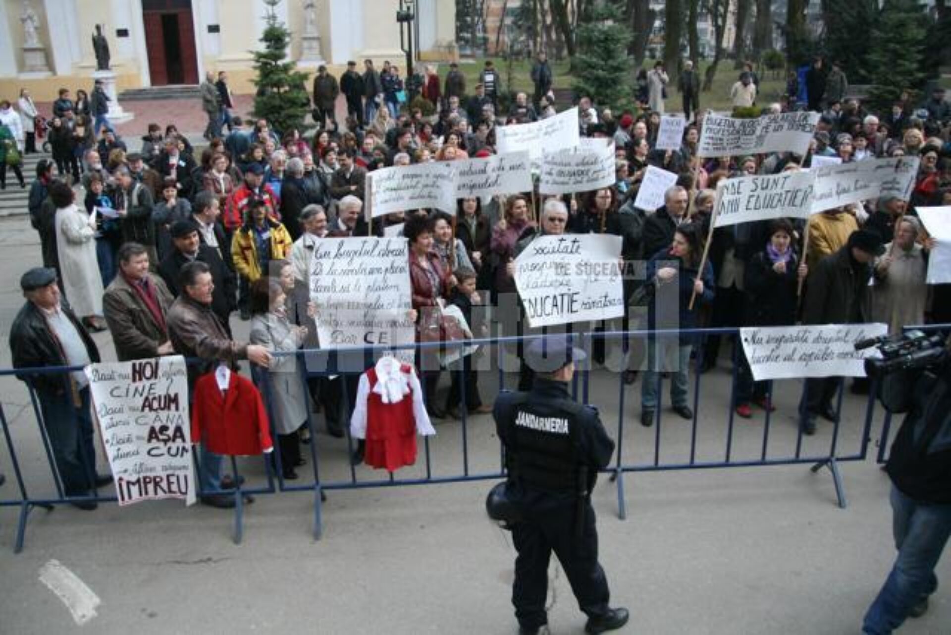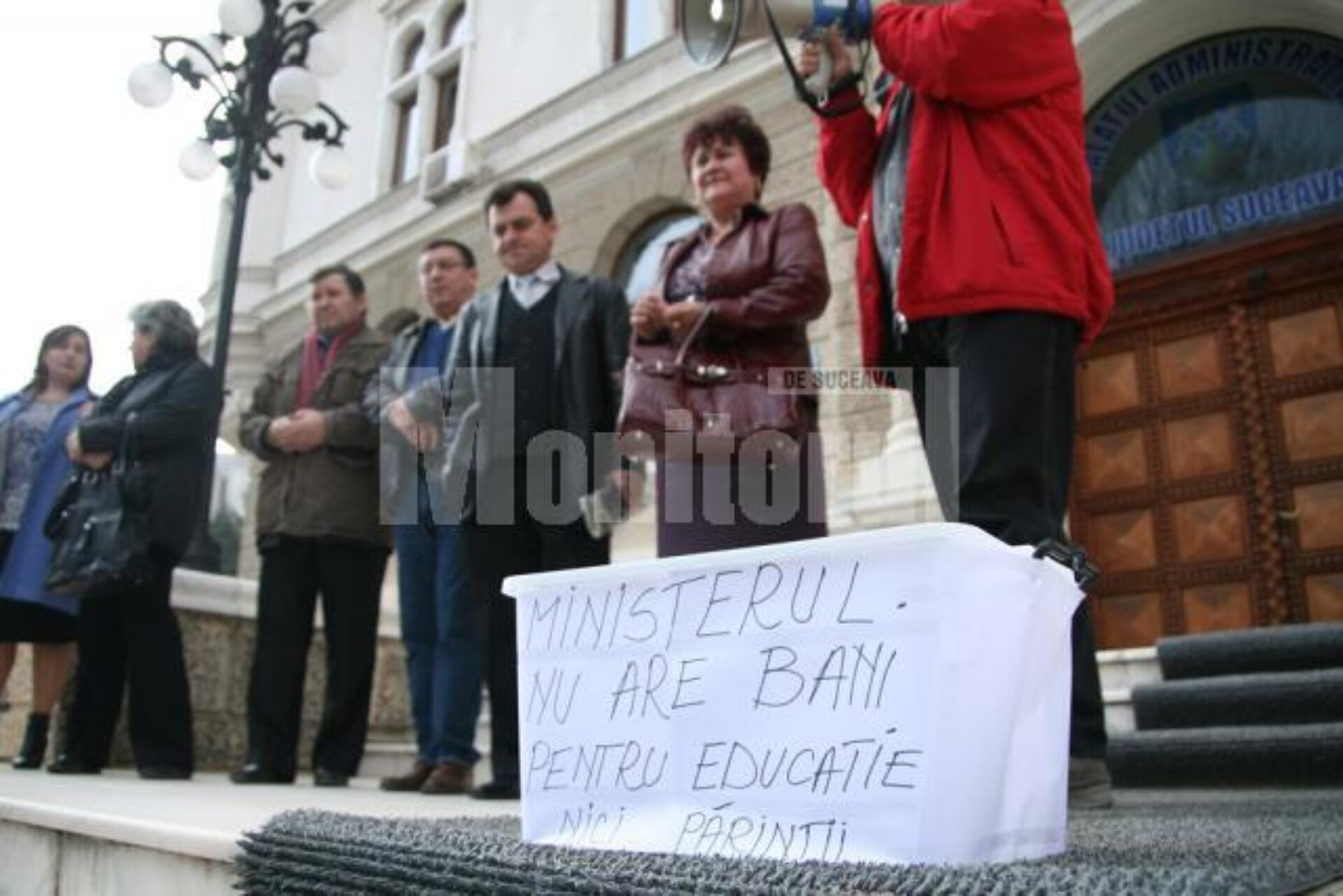 Peste 250 de cadre didactice din județ au pichetat ieri, timp de o oră jumătate, pentru a treia oară, Palatul Administrativ, susținând că au fost dezinformați și mințiți, iar ministrul Educației, Daniel Funeriu, trebuie să renunțe la funcția pe care o deține pentru că nu este competent. Deși până acum au acționat separat, la protestul de ieri au fost prezenți reprezentanții tuturor sindicatelor din municipiul Suceava, din zona Fălticeniului, Humorului și Dornelor, profesorii menționând că incompetența autorităților locale și a ministrului Funeriu i-a făcut să acționeze ca o forță unitară.