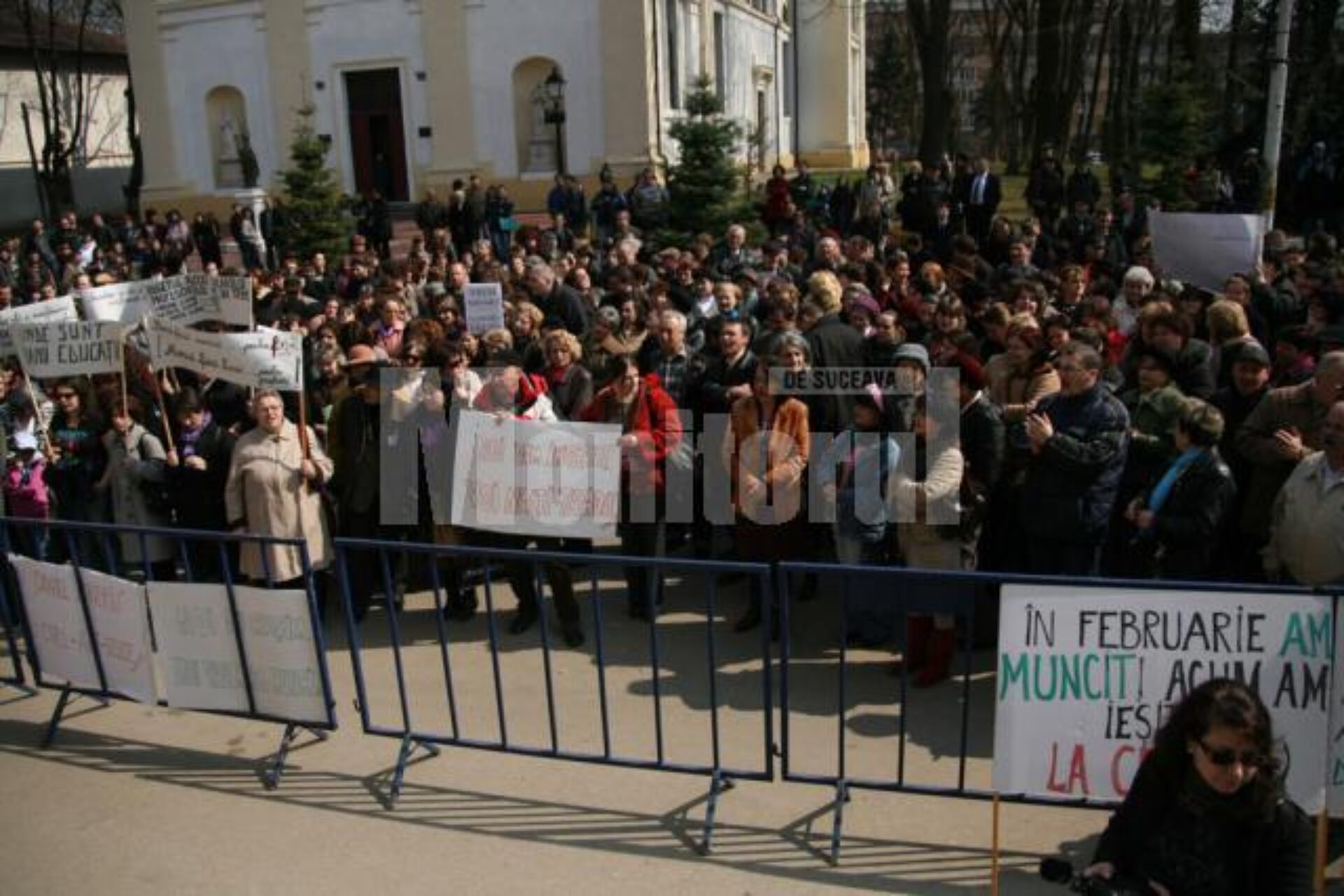 Mai mulți lideri de sindicat au fost primiți de prefectul Sorin Arcadie Popescu, acesta informându-i că banii încă nu au intrat în conturile profesorilor, iar întârzierea a fost cauzată de încercarea de realocare a banilor de la primăriile care aveau bani în plus. Prefectul a mai precizat că profesorii din școlile care nu au câștigat în instanță în baza Legii 221/2008 își vor primi salariile integrale, ceilalți vor primi doar un avans, iar restul salariului îl vor lua după 5 aprilie. Protestatarii nu au fost de acord cu declarațiile prefectului și au hotărât continuarea grevei. „Vom continua greva, nu ar fi normal să cedăm în momentul acesta, Guvernul intenționează să emită o ordonanță de urgență prin care să fie uniformizate salariile din Educație, iar în modul acesta drepturile noastre câștigate în instanță ar fi anulate”, a explicat Costică Costan, liderul sindicatului de la Colegiul Național „Ștefan cel Mare” Suceava.