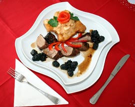 Mușchiul de căprioară se fasonează bine după care frige în unt topit. Se stinge cu coniac și se adaugă vin roșu sec. Merele se curăță și se sotează în unt cu scorțișoară timp de 10 minute după care se pasează sub formă de piure. Din fructele de pădure se prepară un sos cu unt (prin fierbere). Se servește cu vin roșu sec.