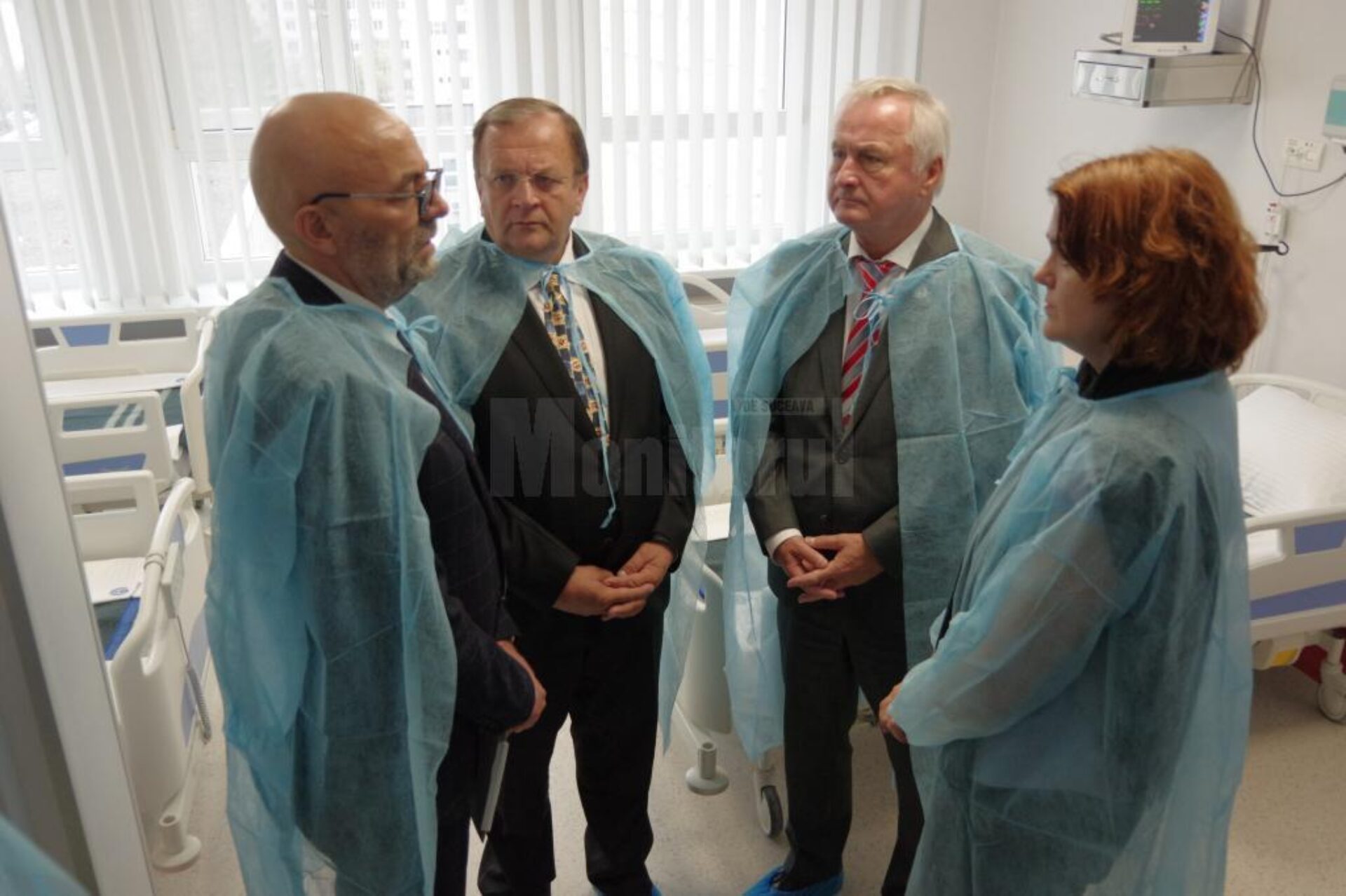Secția Cardiologie din cadrul Spitalului de Urgență „Sfântul Ioan cel Nou” din Suceava, extinsă și modernizată, a fost recepționată, joi, de managerul Vasile Rîmbu, în prezența președintelui Consiliului Regional Schwaben, Jürgen Reichert, și al Consiliului Județean Suceava, Gheorghe Flutur. Președintele Reichert este la finalul mandatului și a venit la Suceava, cu care Regiunea Schwaben are un parteneriat funcțional de peste 20 de ani, într-o vizită de rămas bun. Cei doi președinți au avut numai cuvinte de apreciere la adresa activității de la spital și a managerului Vasile Rîmbu. „Ați făcut primul pas către un spital clinic, unde cercetarea medicală are un rol foarte important. Asemenea instituții sunt foarte importante pentru locuitorii unei regiuni”, a declarat președintele Reichert, care le-a sugerat managerului Rîmbu și președintelui Gheorghe Flutur să aibă în vedere un sistem de interconectare video cu celelalte spitale din județ, cu Spitalul de Urgență coordonator, pentru ca medicii să poată colabora la cazuri deosebite și acestea să poată fi rezolvate la fiecare unitate medicală în parte. Același sistem poate fi aplicat și între spitalul județean și institute clinice din țară și din străinătate. „Astfel, acest centru poate deveni mult mai valoros în regiune pentru pacienți”, a mai spus șeful Consiliului Regional Schwaben.Decizia de extindere a secției Cardiologie cu încă un etaj, prin supraînălțarea corpului F al spitalului, a fost luată de spital și Consiliul Județean în iulie, anul trecut.Prin extindere, numărul de paturi a crescut de la 60 la 80, dintre care 15 paturi Terapie intensivă coronarieni, cu dotare la cele mai înalte standarde. Cinci paturi sunt dedicate radiologiei intervenționale, iar 60 de paturi sunt dispuse în 16 saloane cu patru paturi și două rezerve cu două paturi. Secția mai cuprinde două cabinete de explorări funcționale, un cabinet monitorizare test de efort, sală de mese și alte spații necesare bunei funcționări. La Cardiologie, pe cele două niveluri, lucrează opt medici titulari, trei medici cu contract de prestări servicii, 16 asistenți medicali, nouă infirmiere și două îngrijitoare. Medic-șef este dr. Titel Cojocaru. Valoarea totală a investiției în extinderea cu un etaj, reabilitarea totală a spațiului alocat la etajul VI și în dotare se ridică la 7,4 milioane de lei, adică aproximativ 2 milioane de euro. Finanțarea a fost asigurată de Consiliul Județean Suceava (etaj VII) și fondurile proprii ale spitalului (modernizarea etajului VI). Angiograful dedicat Cardiologiei, care va intra în dotarea secției până la sfârșitul acestui an, este achiziționat cu fonduri de la Ministerul Sănătății.