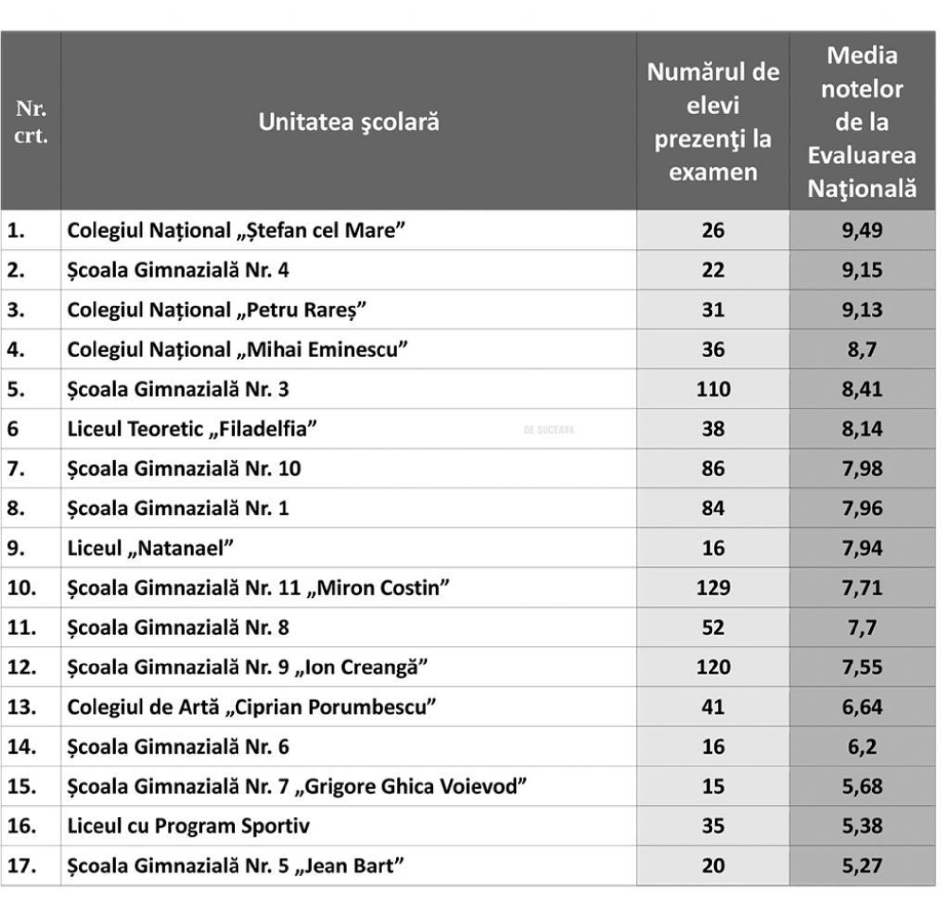 17 unități de învățământ din municipiul Suceava, atât școli gimnaziale, cât și licee care includ ciclu gimnazial,au organizat examenul de evaluare națională. Am încercat să le ierarhizăm pe toate având drept criteriumedia aritmetică a tuturor notelor de la evaluarea națională. De menționat că topul este realizat înainte de publicarea rezultatelor finale, de rezolvarea contestațiilor, eventualele modificări putând influența ușor ierarhia unităților.