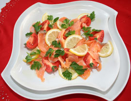 Somonul afumat se taie în felii foarte subțiri cu un cuțit bine ascuțit. Se așează într-o farfurie pe fundul căreia s-a întins uleiul de măsline și un praf de piper. Printre bucățile de somon se așează roșiile cherry tăiate în patru. Se ornează cu felii de lămâie și pătrunjel proaspăt, după preferință se poate folosi și rucola proaspătă.