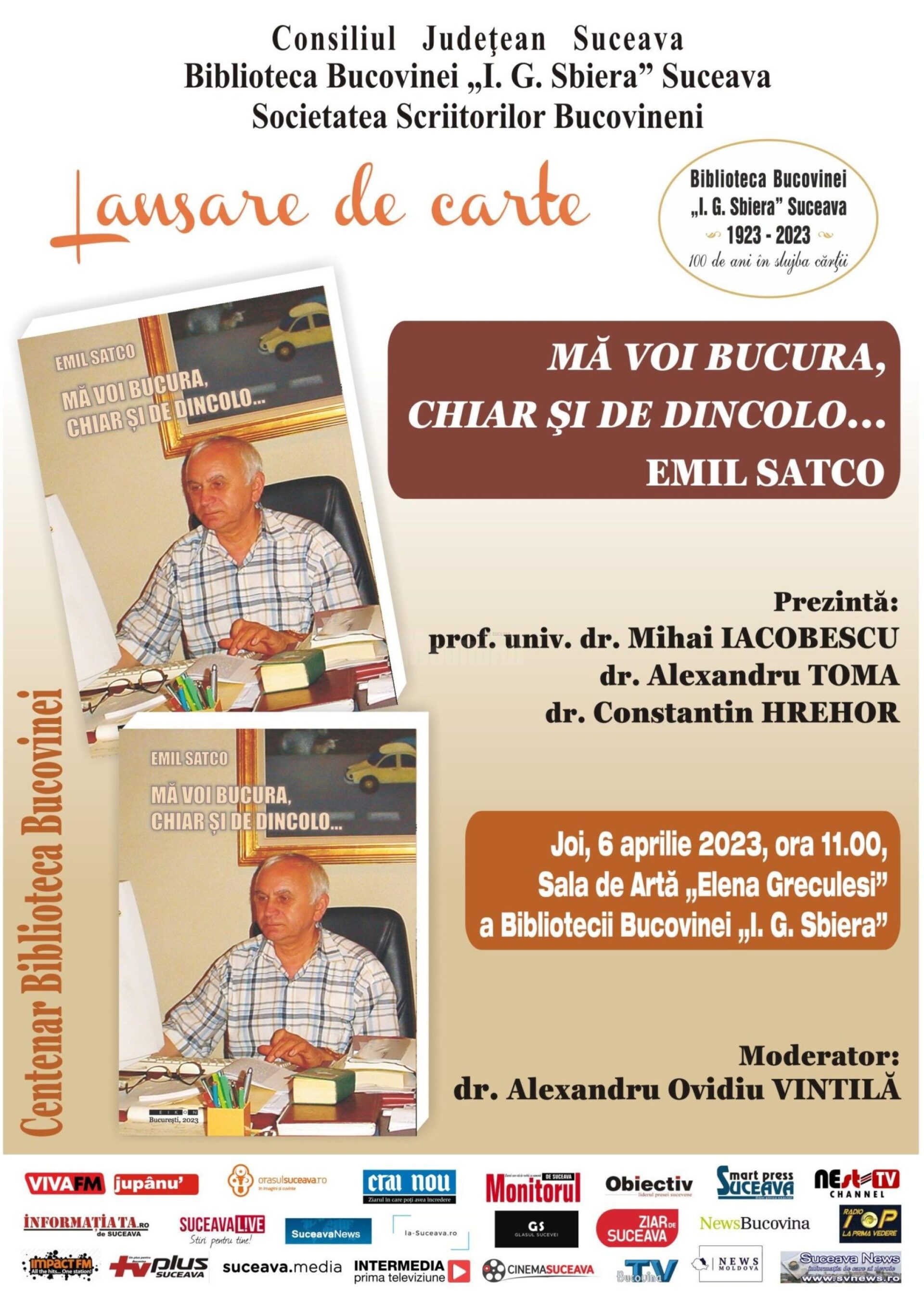 Biblioteca Bucovinei „I. G. Sbiera” Suceava, în Anul Centenarului său, îl omagiază pe cărturarul și enciclopedistul Emil Satco. În Sala de Artă „Elena Greculesi” a Bibliotecii Bucovinei „I.G. Sbiera”va fi lansat joi, 6 aprilie 2023, de la ora 11.00, volumul „Mă voi bucura, chiar și de dincolo…” de Emil Satco, realizat postum de Alis Niculică. Despre autor și carte vor vorbi prof. univ. dr. Mihai Iacobescu, dr. Alexandru Toma și dr. Constantin Hrehor.
