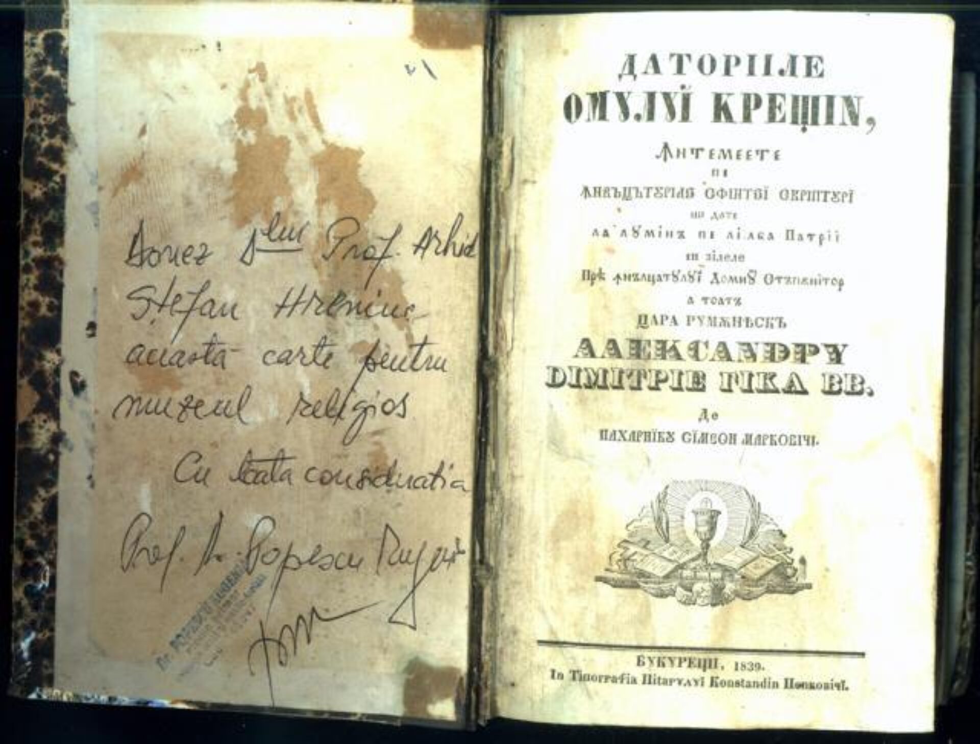 Recent, distinsa Eugenia Popescu, profesor universitar la Facultatea de Medicină din iași, cunoscut chirurg la Spitalul Sf. Spiridon Iași, aflând de strădania mea de a organiza un muzeu etnografic și religios, mi-a dăruit o carte tipărită cu litere chirilice în tipografia pitarului Constantin Pencovici din București în anul 1839.