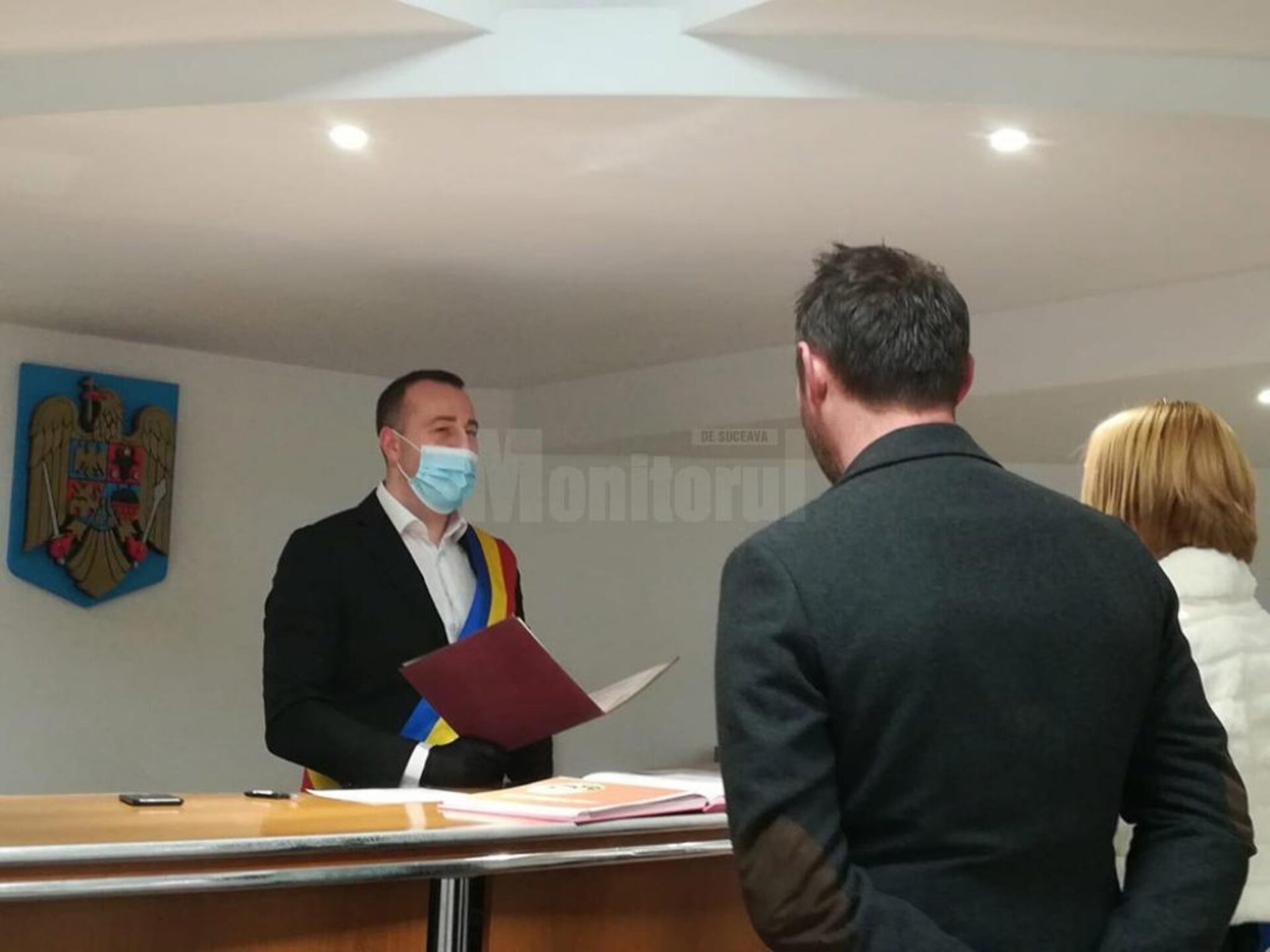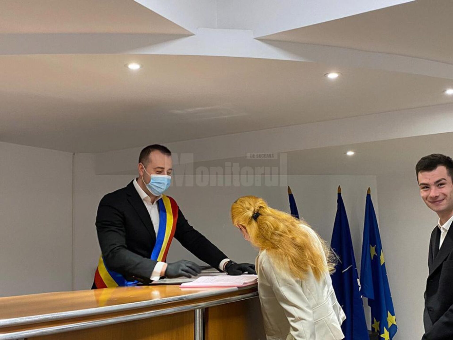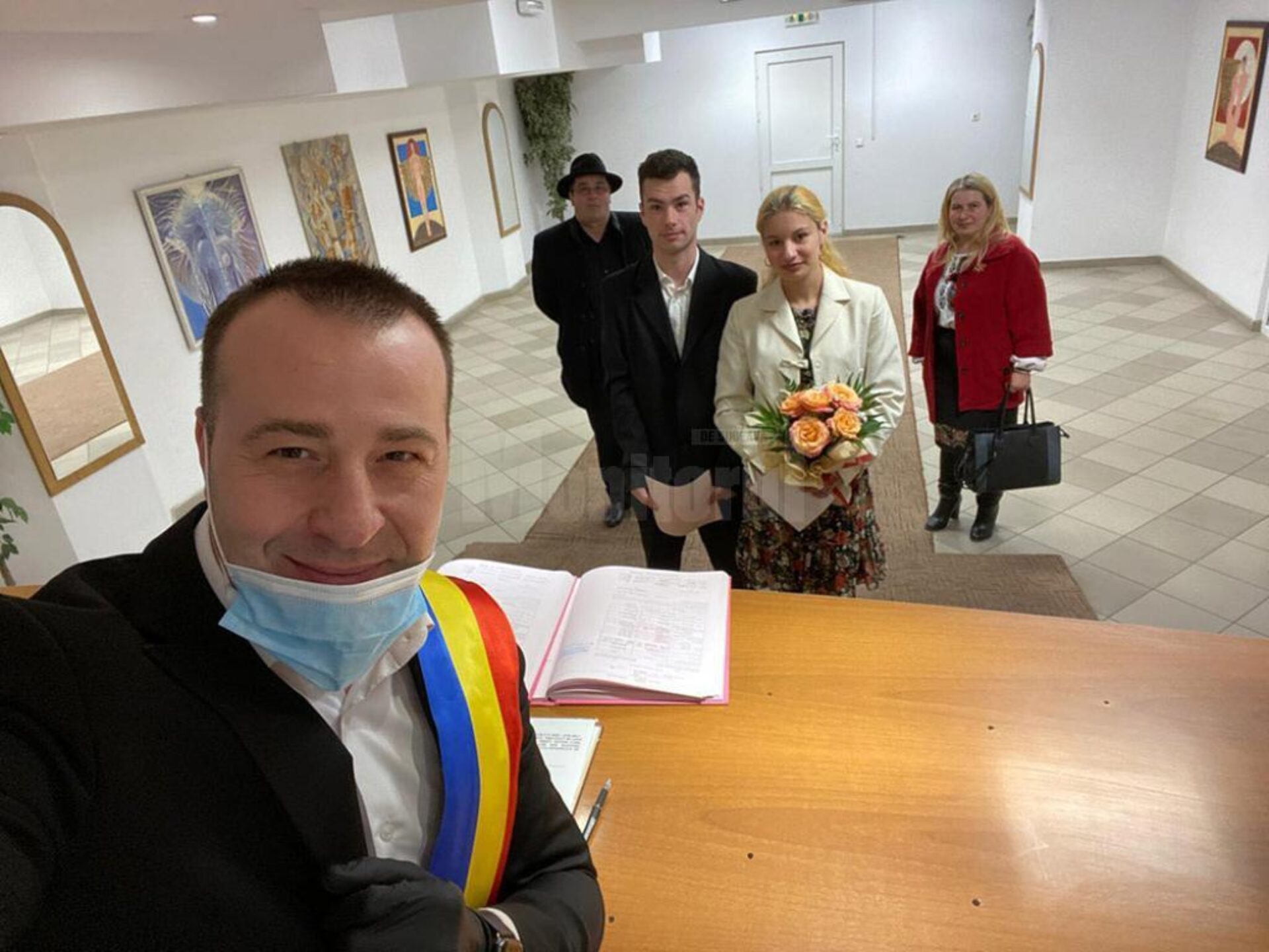 Tinerii au respectat prevederile situației de urgență care le impune să fie sub opt persoane la eveniment și au venit inclusiv cu măștile pe față, la fel ca și viceprimarul Lucian Harșovschi, care le-a oficiat cununia civilă.