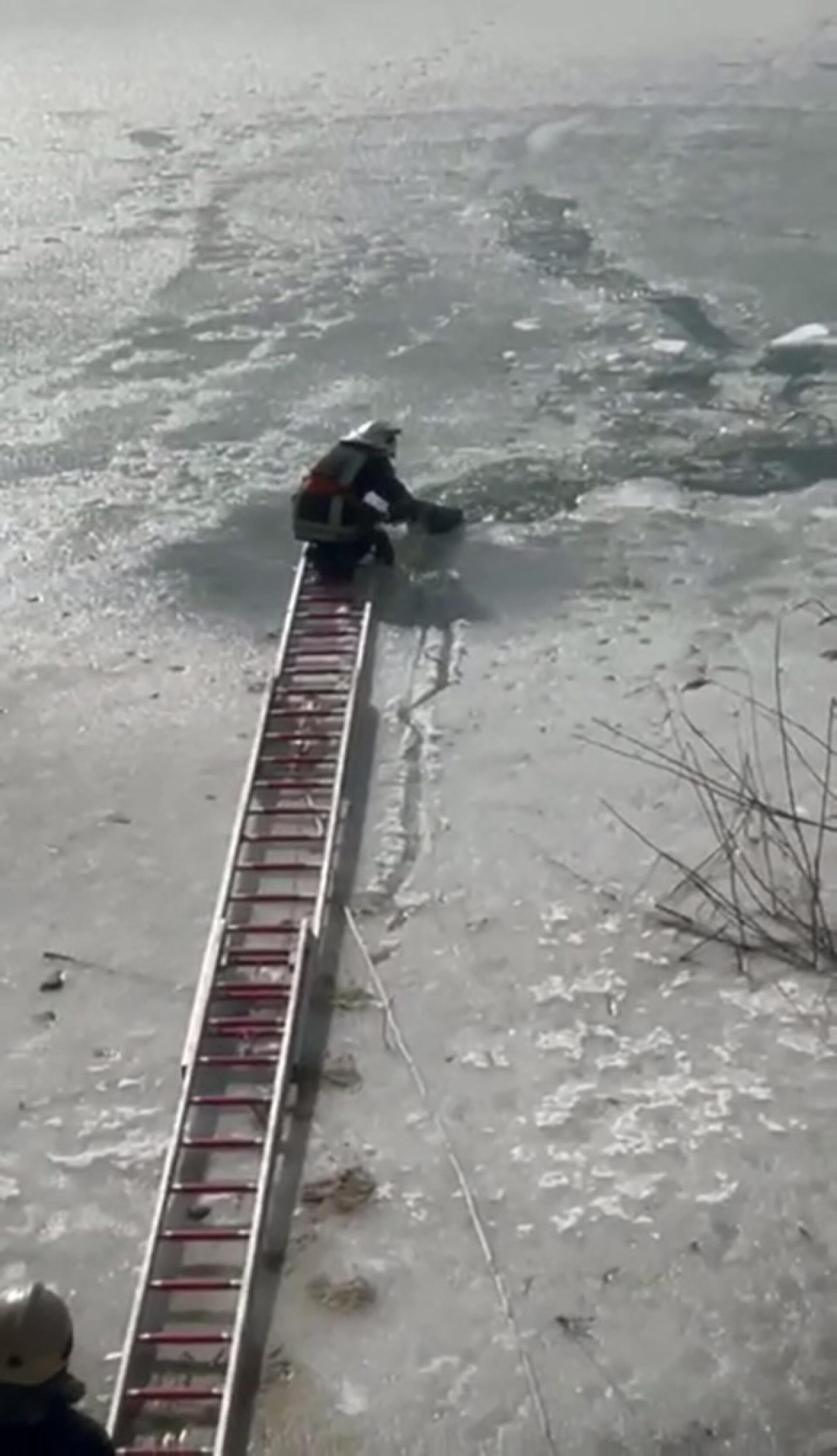 Pompierii de la Garda de Intervenție Siret au întins o scară culisabilă, iar un pompier s-a deplasat pe gheață, a prins cățelul și l-a adus la mal.