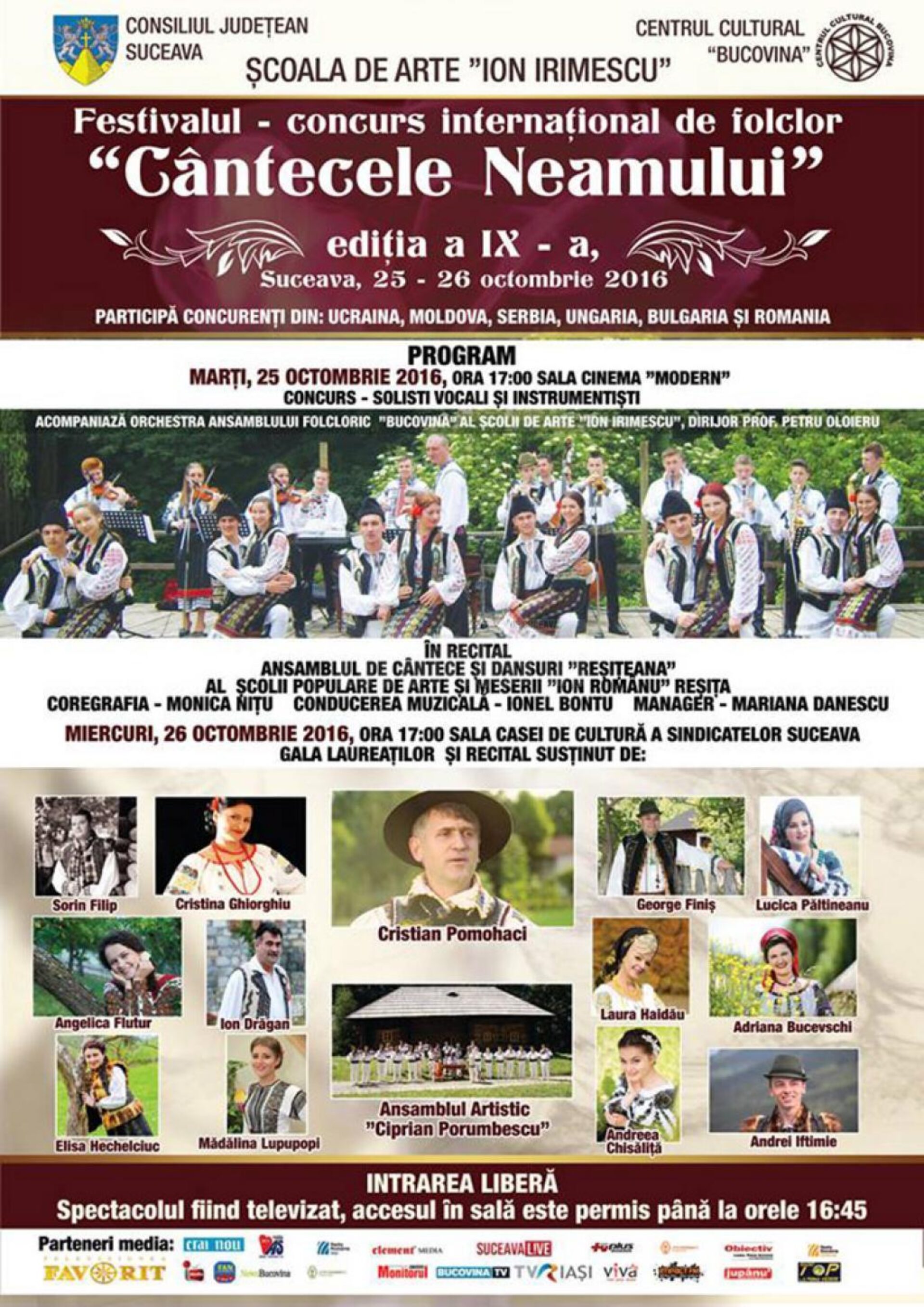 Consiliul Județean Suceava, Centrul Cultural „Bucovina” – Școala de Arte „Ion Irimescu” Suceava organizează, în zilele de 25-26 octombrie a.c., cea de-a IX-a ediție a Festivalului-concurs internațional de folclor „Cântecele Neamului”,