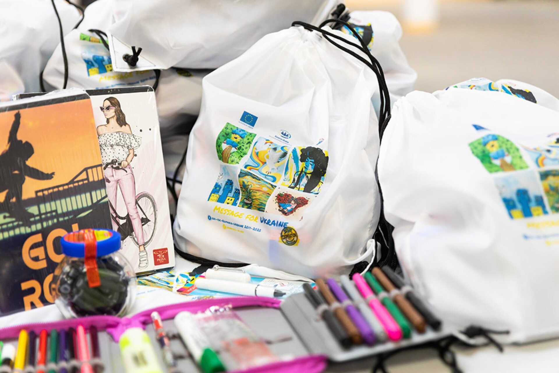 Pe lângă realizarea impresionantei lucrări de artă murală și organizarea evenimentelor, de o parte și de alta a granițelor, campania “Mesaj pentru Ucraina” a inclus transmiterea a peste 500 de pachete cu rechizite școlare către 5 școli din Ucraina, în regiunile din aria Programului: Cernăuți, Ivano-Frankivsk, Zakarpattya, Odessa.