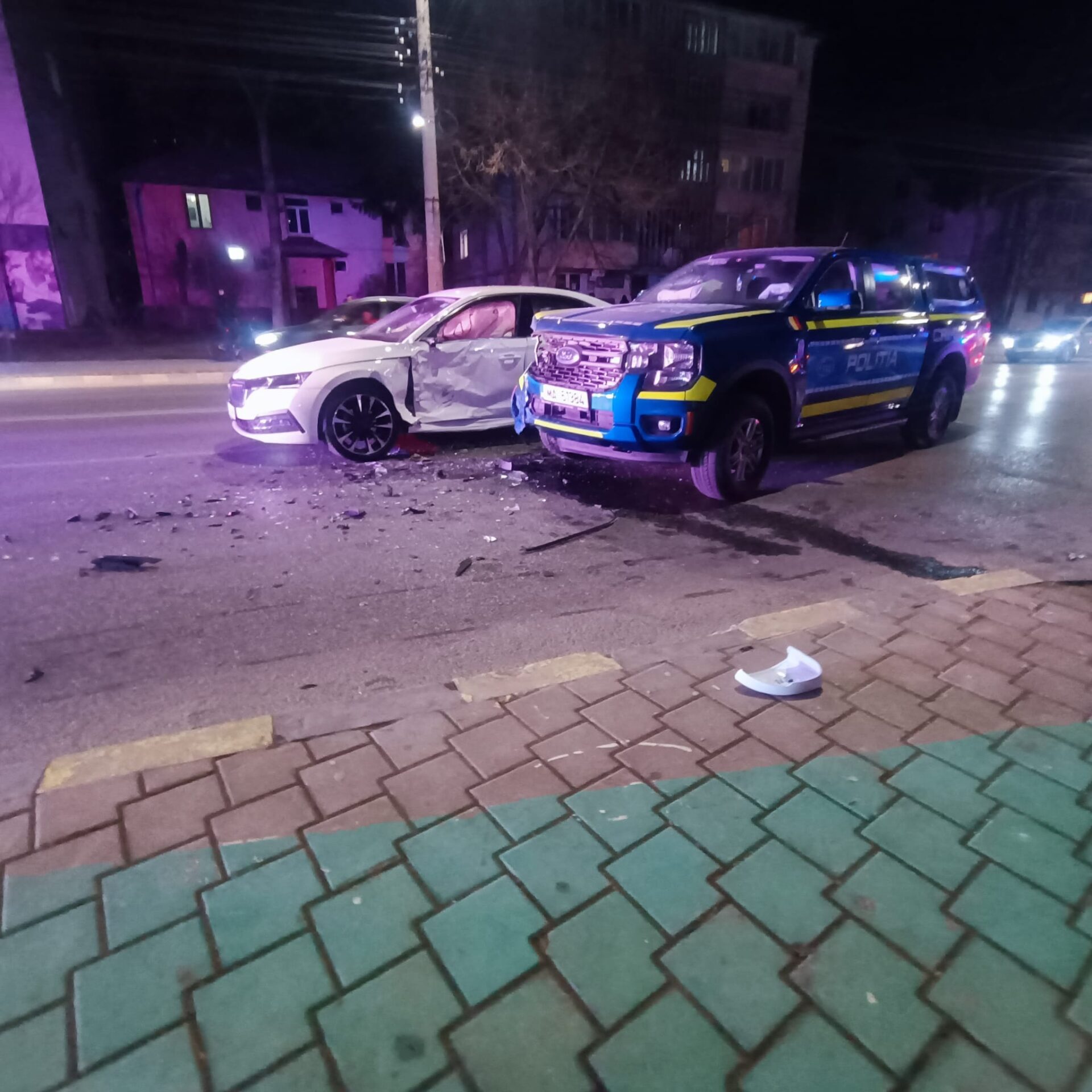 În jurul orei 19.45, autovehiculul marca Ford aparținând Poliției s-a ciocnit cu un alt autovehicul, marca Skoda.