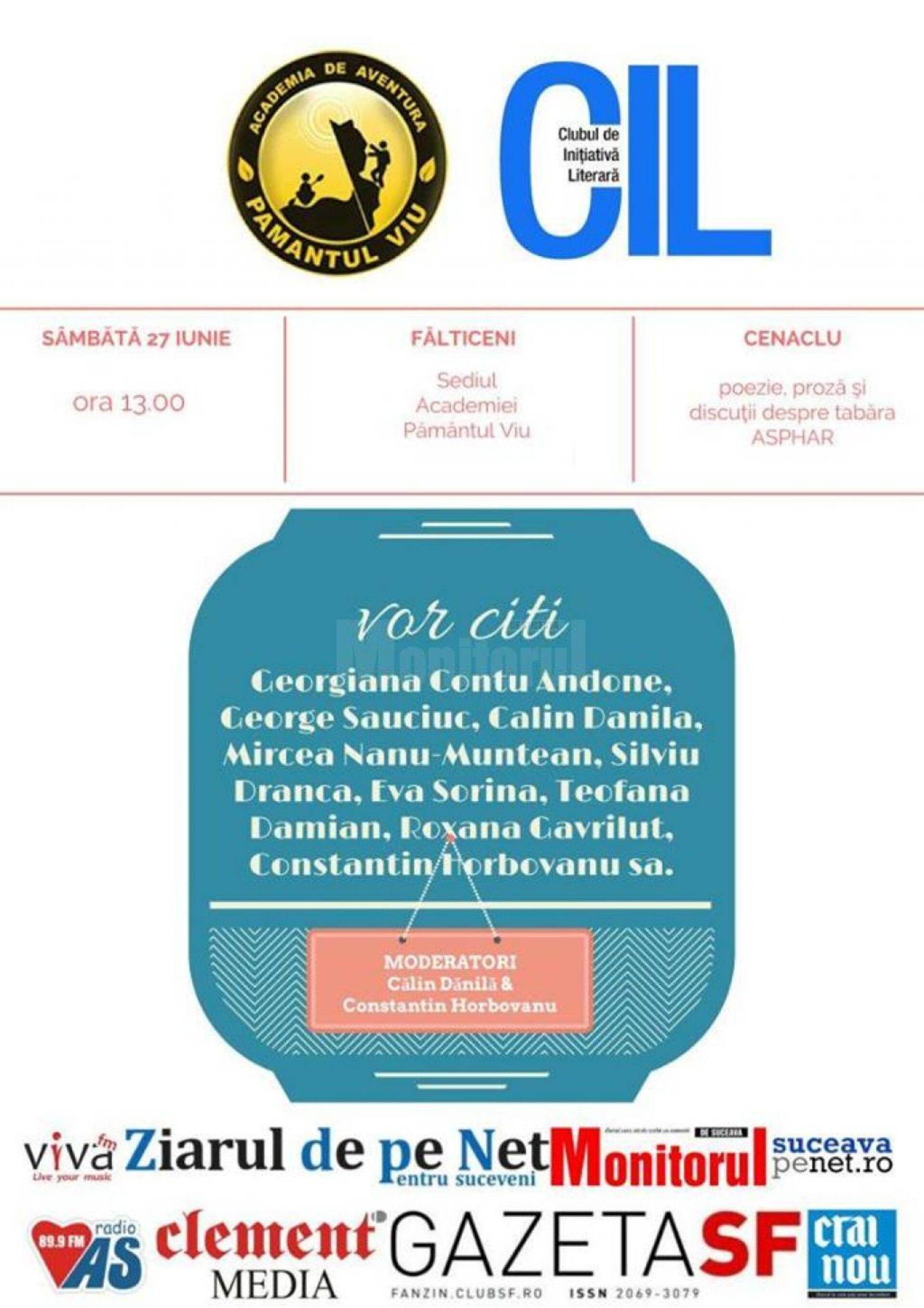 Academia de Aventură „Pământul Viu” împreună cu Clubul de Inițiativă Literară (CIL) organizează sâmbătă, 27 iunie, începând cu ora 13.00, la Fălticeni, un cenaclu de lectură în aer liber.Vor citi Georgiana Conțu Andone, George Sauciuc, Călin Dănilă, Mircea Nanu-Muntean, Silviu Drancă, Eva Sorina, Teofana Damian, Roxana Gavriluț, Constantin Horbovanu ș.a.Moderatori: Călin Dănilă și Constantin Horbovanu.
