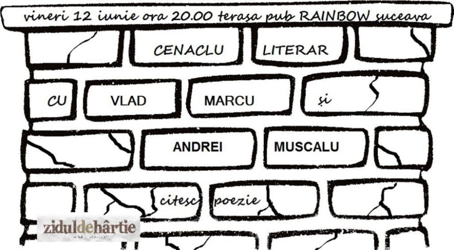 Membriigrupului literar-artistic „Zidul de Hârtie” se întâlnesc vineri, 12 iunie, la ora 20.00, pe terasa Rainbow (alias Rimbaud) din municipiul Suceava (str. Mihai Viteazu, nr. 40) la o ședință de cenaclu care-i va avea ca protagoniști pe tinerii poeți Vlad Marcu și Andrei Muscalu, proaspăt absolvenți ai Colegiului Național „Petru Rareș” Suceava. Cei doi vor citi din versurile lor, apoi va urma o discuție moderată de poetul Florin Dan Prodan.