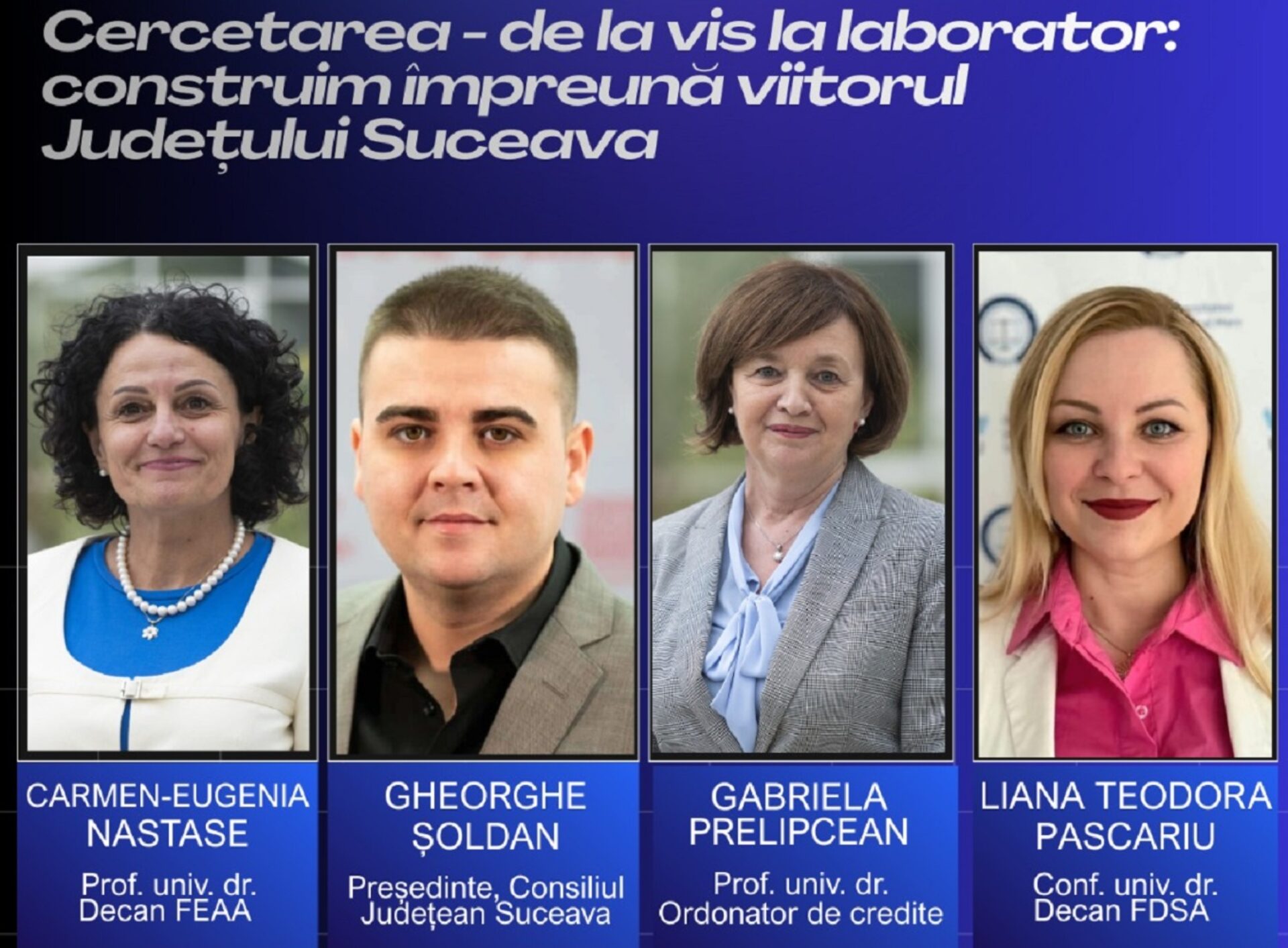 Alma mater sucevensis va fi reprezentată de prof. univ. dr. Gabriela Prelipcean, ordonator de credite al USV, prof. univ. dr. Carmen Năstase, decan al Facultății de Economie, Administraţie şi Afaceri, și de conf. univ. dr. Liana – Teodora Pascariu, decan al Facultății de Drept şi Ştiinţe Administrative. La eveniment vor participa studenţi, masteranzi, doctoranzi, cadre didactice ale USV și membri ai grupului ţintă, iar întâlnirea va fi moderată de prof. univ. dr. Elena – Brânduşa Steiciuc, director COACH USV.
