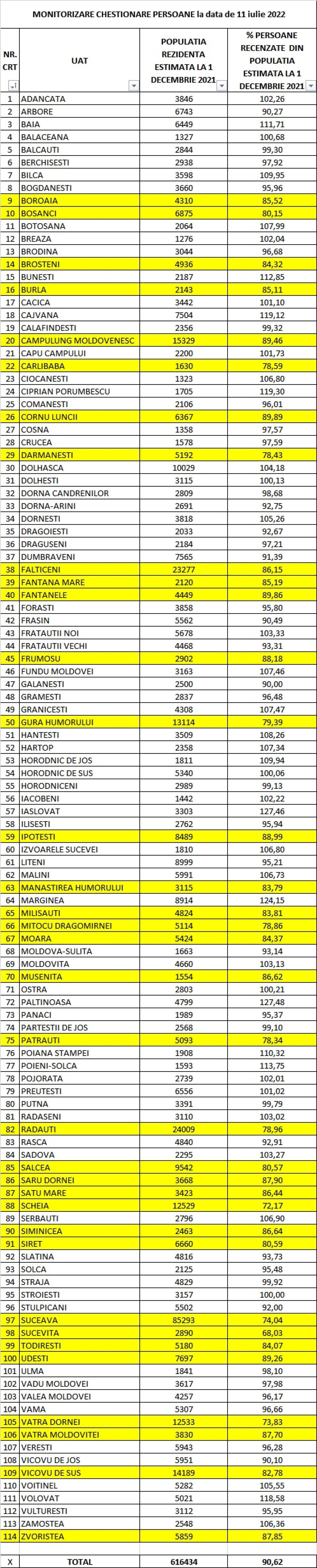 Prefectura Suceava a informat, marți, printr-un comunicat de presă, că până la data de 9 iulie a.c., în județul Suceava s-au recenzat 558.835 de persoane, reprezentând 90,7% populație recenzată și autorecenzată din totalul populației rezidente, estimată la 1 decembrie 2022 la 616.434 persoane.