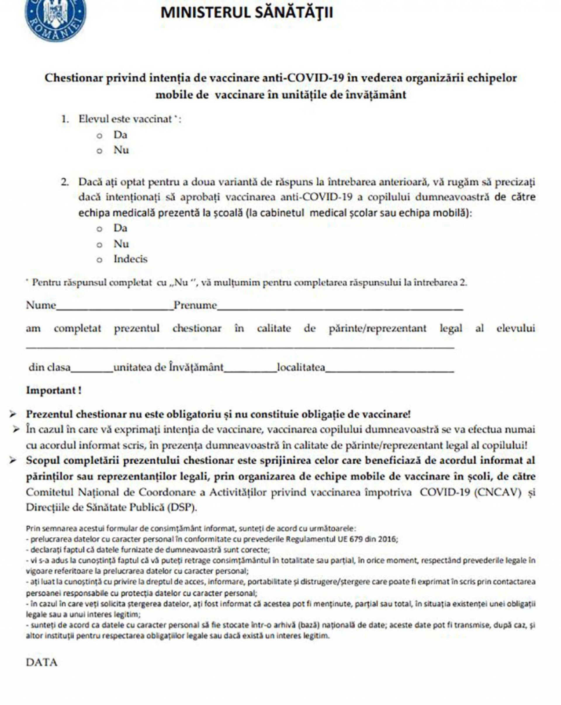 Scopul completării chestionarului este sprijinirea celor care doresc să se vaccineze și beneficiază de acordul informat, exprimat în scris, al părinților sau reprezentanților legali, prin organizarea de echipe mobile de vaccinare în școli de către Comitetul Național de Coordonare a Activităților privind vaccinarea împotriva COVID-19 (CNCAV) și Direcțiile de Sănătate Publică. Chestionarele nu necesită asumare prin semnătură și pot fi transmise și în format electronic, mai transmis reprezentanții Ministerului Educației.