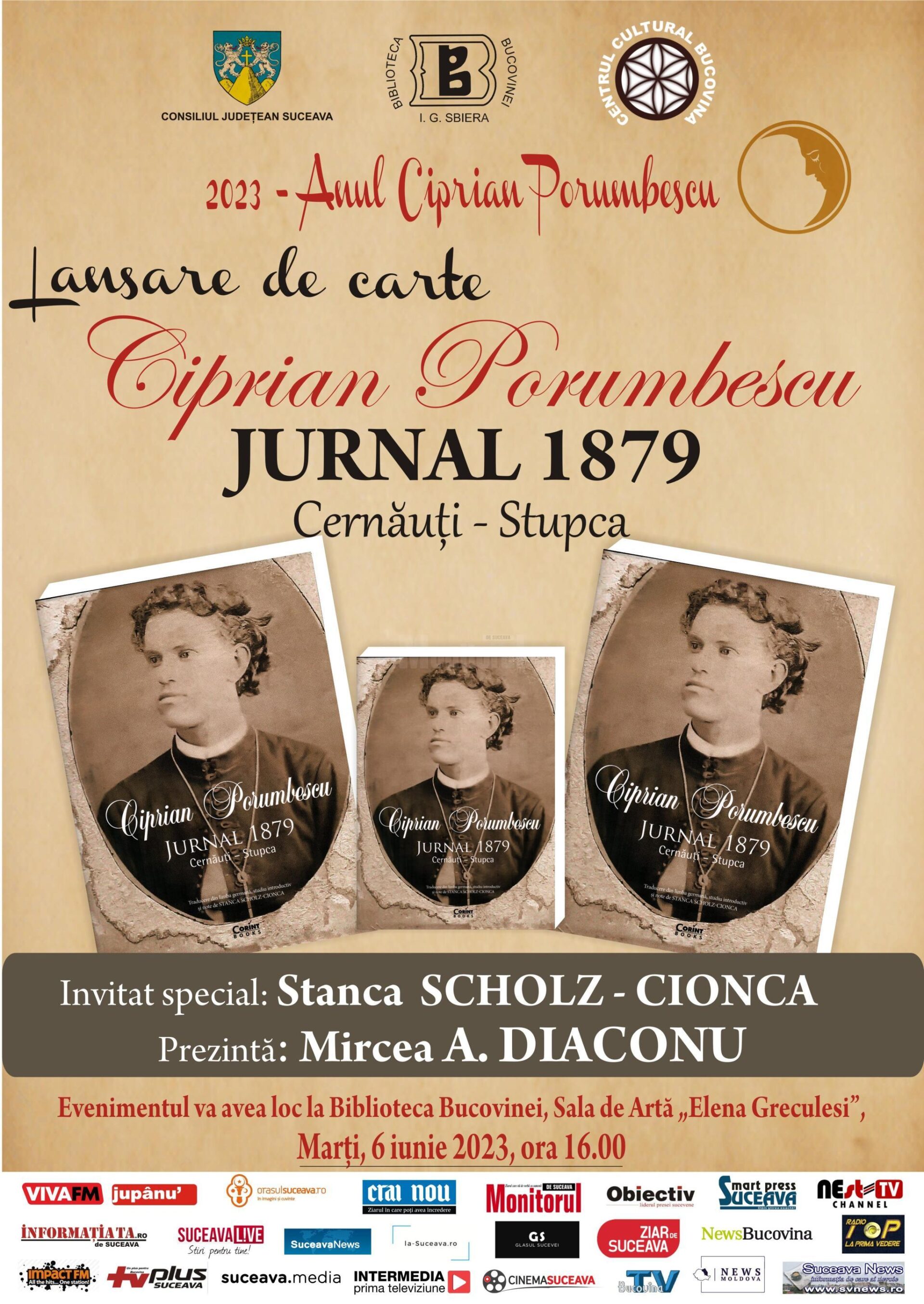 Biblioteca Bucovinei „I. G. Sbiera” și Centrul Cultural Bucovina, sub egida Consiliului Județean Suceava, organizează marți, 6 iunie, începând cu ora 16.00, un nou eveniment în cadrul Programului „2023 – Anul Ciprian Porumbescu”, și anume lansarea cărții „Ciprian Porumbescu, Jurnal 1879: Cernăuți-Stupca”, traducere, studiu introductiv și note de Stanca Scholz-Cionca.