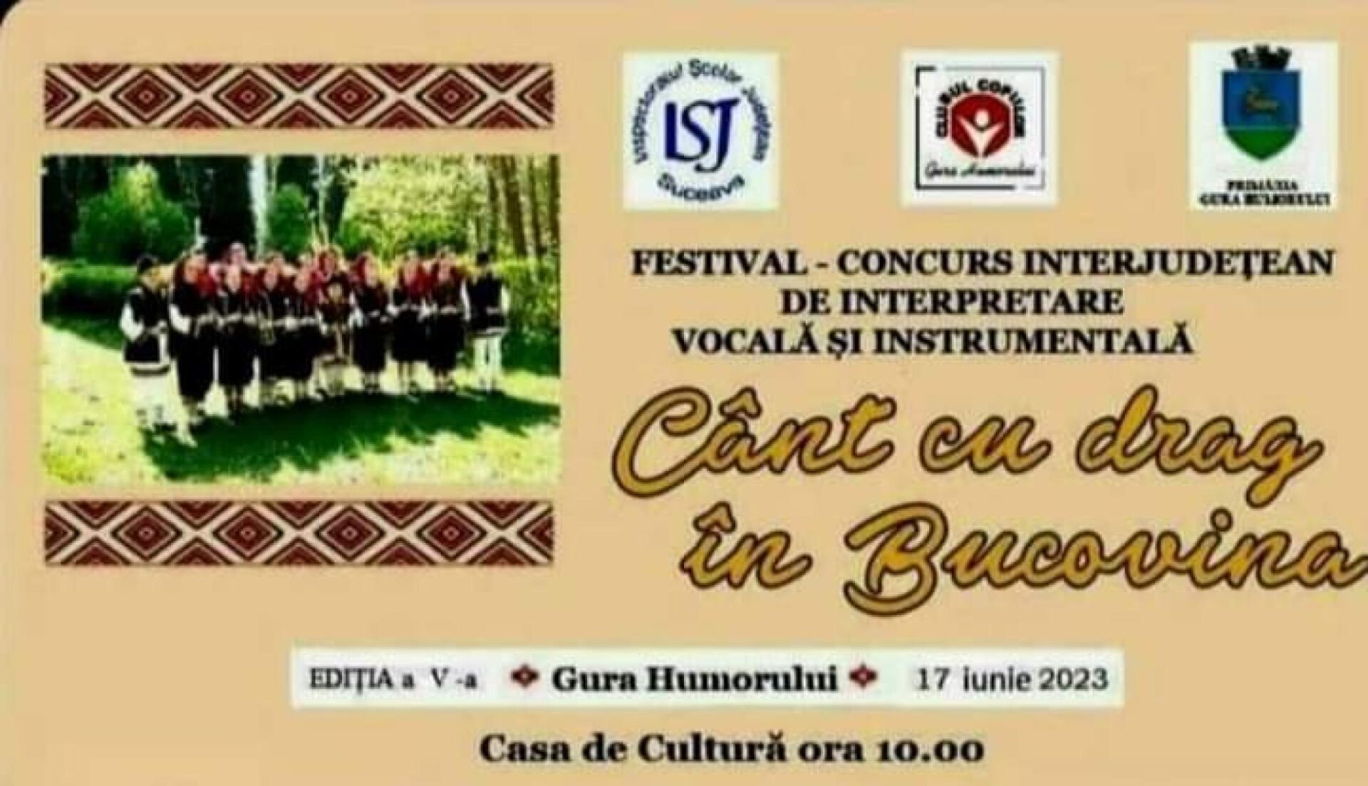 Centrul Cultural Gura Humorului a găzduit sâmbătă, 17 iunie, a V-a ediție a Festivalului Interjudețean de Folclor – Concurs de Interpretare Vocală și Instrumentală „Cânt cu drag în Bucovina” organizat de Clubul Copiilor Gura Humorului, sub coordonarea prof. Luminița Chiriac.