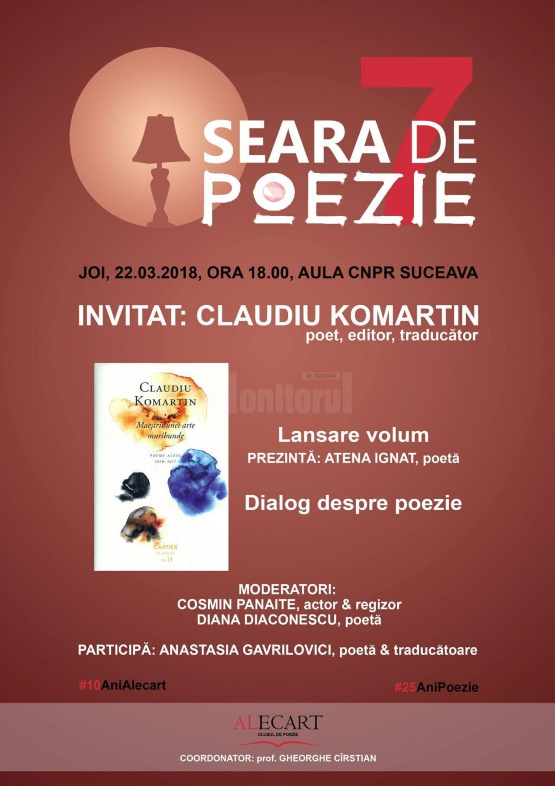 Clubul de Poezie Alecart (timp de 15 ani – Cenaclul literar “Săgetătorul”) împlinește un sfert de secol. „De 25 de ani (din septembrie 1993), facem casă bună cu poezia. Zicem cu bucurie: 100 de ani de Românie, 25 de ani de poezie. În septembrie, Clubul de Poezie va sărbători cum se cuvine. Să tot fie: lansare antologie #25AniPoezie, conferință despre poezie, premiere Concursul de Poezie Alecart”, transmite prof. Gheorghe Cîrstian, de la Colegiul „Petru Rareș” Suceava.În mai 2018, proiectul Alecart (revista et comp.) împlinește 10 ani (primul număr, în formula de parteneriat de astăzi, apare în mai 2008). Coordonatorii proiectului (la Iași: Emil Munteanu, inițiatorul proiectului, și Nicoleta Munteanu; la Suceava: prof. Gheorghe Cîrstian) vorbesc de o sărbătoare Alecart. Timp de trei zile se vor organiza manifestări culturale fel de fel (lansare revista Alecart 20, dezbatere pe tema jurnalismului cultural, dialog cu scriitorii, alte activități). „Dacă ne ajută Bunul Dumnezeu (să recunoaștem: poet de invidiat în cam tot ce-a scris!), vom avea un astfel de eveniment la Suceava. Vom trăi deci și vom vedea”, menționează prof. Cîrstian.Acesta a mai arătat că primăvara aniversară a Clubului Alecart începe cum nu se poate mai bine. Dintre cei 10 finaliști ai Festivalului Național de Arte pentru Liceeni – LicArt, trei sunt membri ai Clubului de Poezie Alecart: Andra Antonia Mihăilescu și Teodora Vlădianu sunt eleve ale Colegiului Național “Petru Rareș” Suceava, Andrei Rusu este elev al Colegiului Național Iași. Finaliștii vor participa la Tabăra de Creație LicArt, care va avea loc în București, la Palatul Mogoșoaia, în perioada 31 martie – 6 aprilie 2018. La Festivalul – Concurs de Literatură “Alexandru Macedonski”, Andra Mihăilescu a obținut premiul al III-lea la secțiunea poezie, iar Dumitrița Bianca Napa (absolventă a Colegiului Național “Petru Rareș” Suceava, în prezent studentă la Medicină în Iași) a primit premiul al II-a la secțiunea Teatru. La Concursul Județean de Poezie „Ion Cozmei”, ediția I, au fost premiați mai mulți alecartieni: Andreea Petrovici (Marele Premiu), Ana-Maria Țebrean (premiul al II-lea), Camelia Grosu (premiul al III-lea), Andra Mihăilescu (premiul Asociației Culturale Pro Basarabia și Bucovina, filiala Arboroasa, Vatra Dornei), Alexandra Apostol (premiul revistei Bucovina Literară), Teona Stavarachi (premiul revistei Cronica Veche, Iași), Paul Florescu (premiul revistei Hyperion, Botoșani), Ioana Redinciuc și Teofana Sandu (premiile revistei Plumb, Bacău), Diana Diaconescu și Teodora Vlădianu (premiile revistei Zona Literară, Iași), Gabriela Tofan (premiul revistei Orașul, Cluj). Premiul revistei Alecart i-a fost acordat elevului Paul Cătălin Bejinariu, de la Colegiul Național “Spiru Haret” Suceava. În următoarea perioadă, Clubul continuă întâlnirile cu poeți importanți, prieteni ai Clubului de Poezie Alecart. O primă întâlnire are loc joi, 22 martie 2018, începând cu ora 18.00, la Seara de Poezie 7. Invitatul serii este cunoscutul și apreciatul poet Claudiu Komartin. Evenimentul va cuprinde lansarea antologiei “Maeștrii unei arte muribunde” (Ed. Cartier) & dialog despre poezie. Prezentarea antologiei va fi făcută de eleva Atena Ignat. Moderatorul evenimentului va fi actorul și regizorul Cosmin Panaite, secondat de eleva Diana Diaconescu. Alecart vă așteaptă cu bucurie la întâlnirea cu poezia. ”Le mulțumim tuturor prietenilor noștri pentru susținerea , de la Suceava, pentru aprecierile lor la adresa talentelor alecartiene. World Poetry Day. Alecart is joy”, a conchis prof. Gheorghe Cîrstian, coordonatorul Clubului de Poezie Alecart.