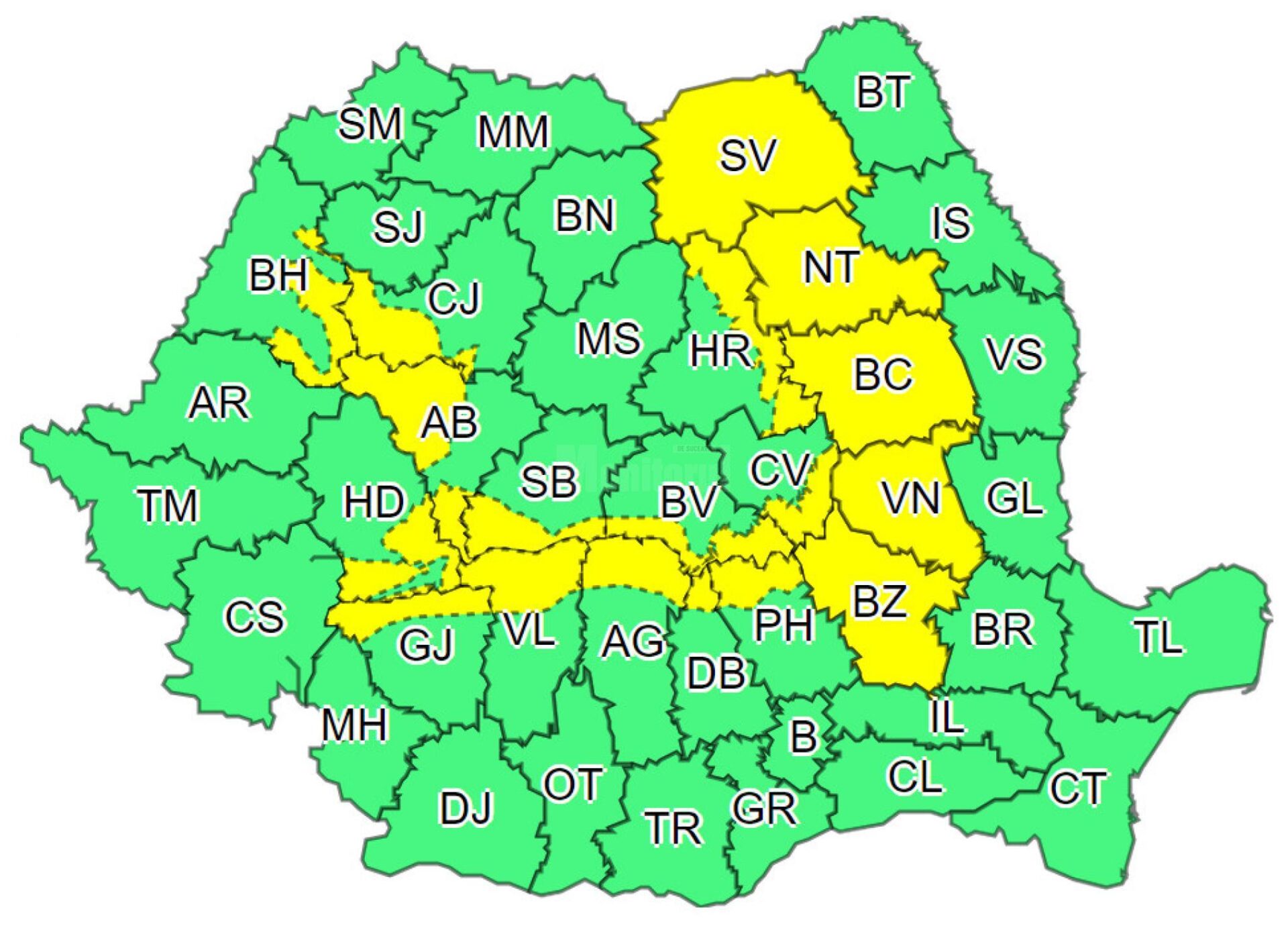 Administrația Națională de Meteorologie a emis marți dimineață o atenționare meteorologică de tip Cod Galben, care vizează întreg județul Suceava dar și județele Neamț, Bacău, Vrancea și Buzău, în intervalul 14 septembrie, ora 12:00 – 14 septembrie, ora 22:00.