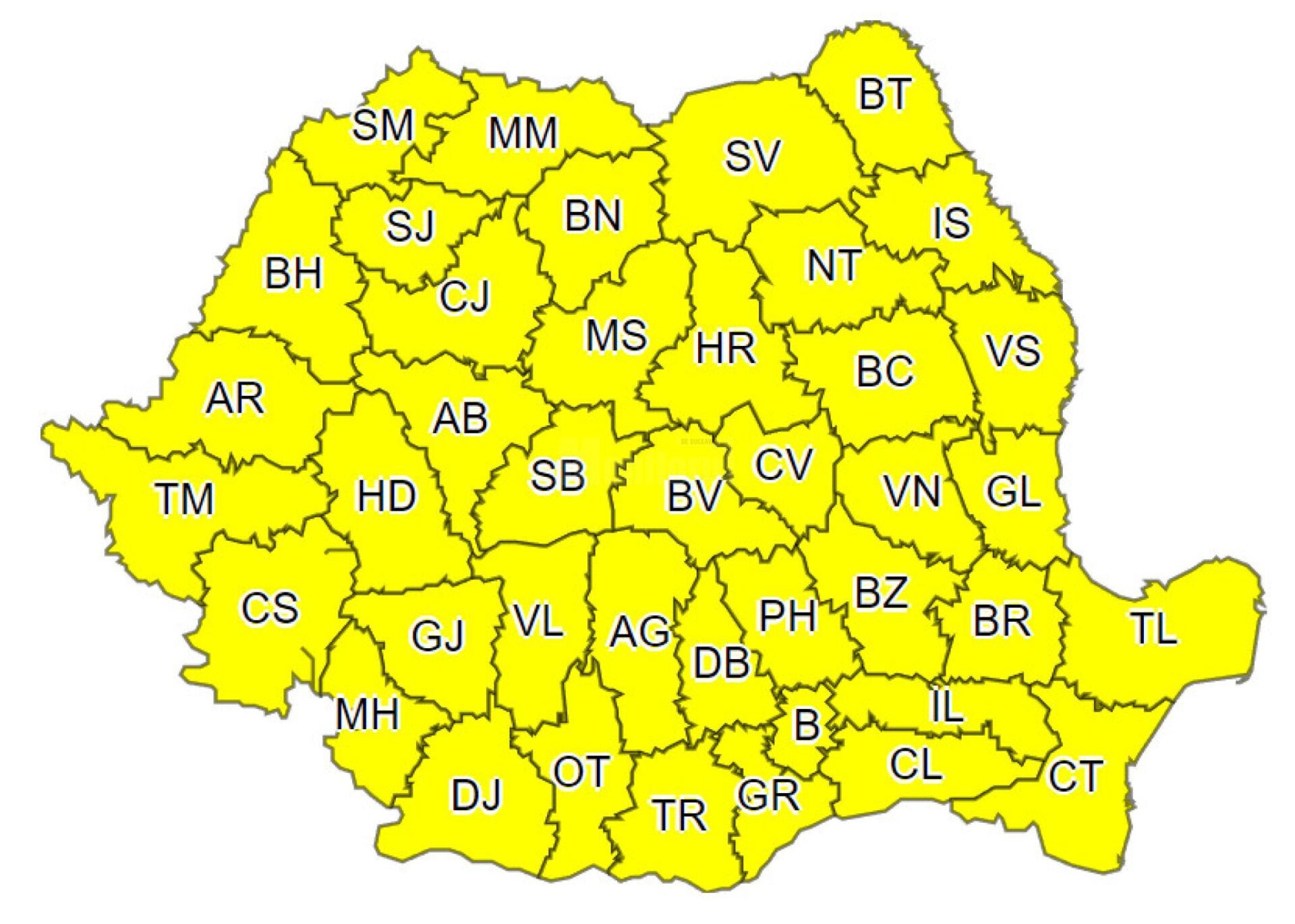 Administrația Națională de Meteorologie a emis vineri două avertizări de tip cod galben, una fiind de furtuni cu ploi abundente și a doua de intensificări ale vântului, cu viteze de 55…75 km/h.