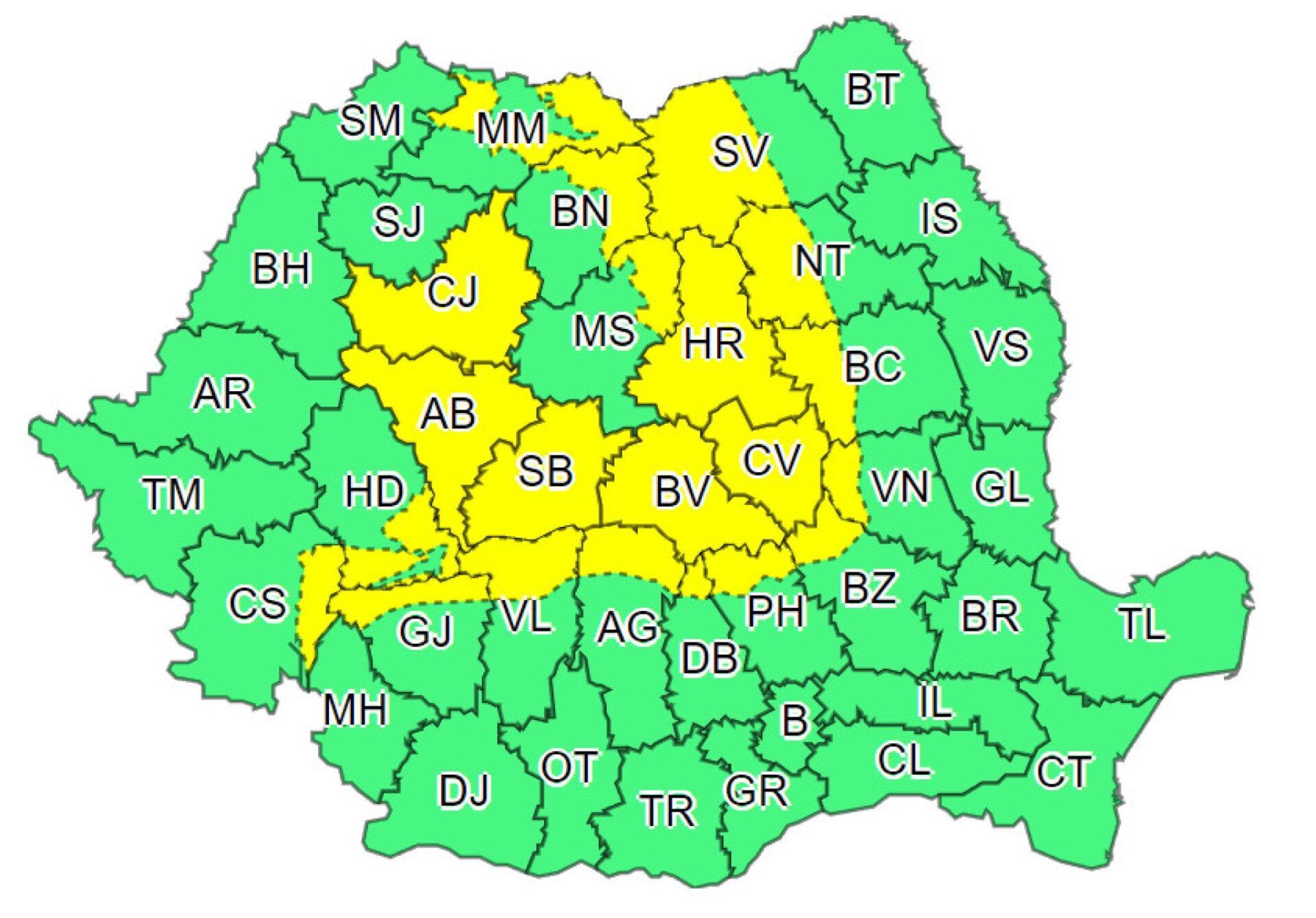 Sub incidența codului galben emis de Administrația Națională de Meteorologie se află jumătate din județul Suceava, iar integral sau parțial, alte 10 județe. Intervalul de valabilitate este 5 ianuarie, ora 14.00 – 6 ianuarie, ora 12.00.