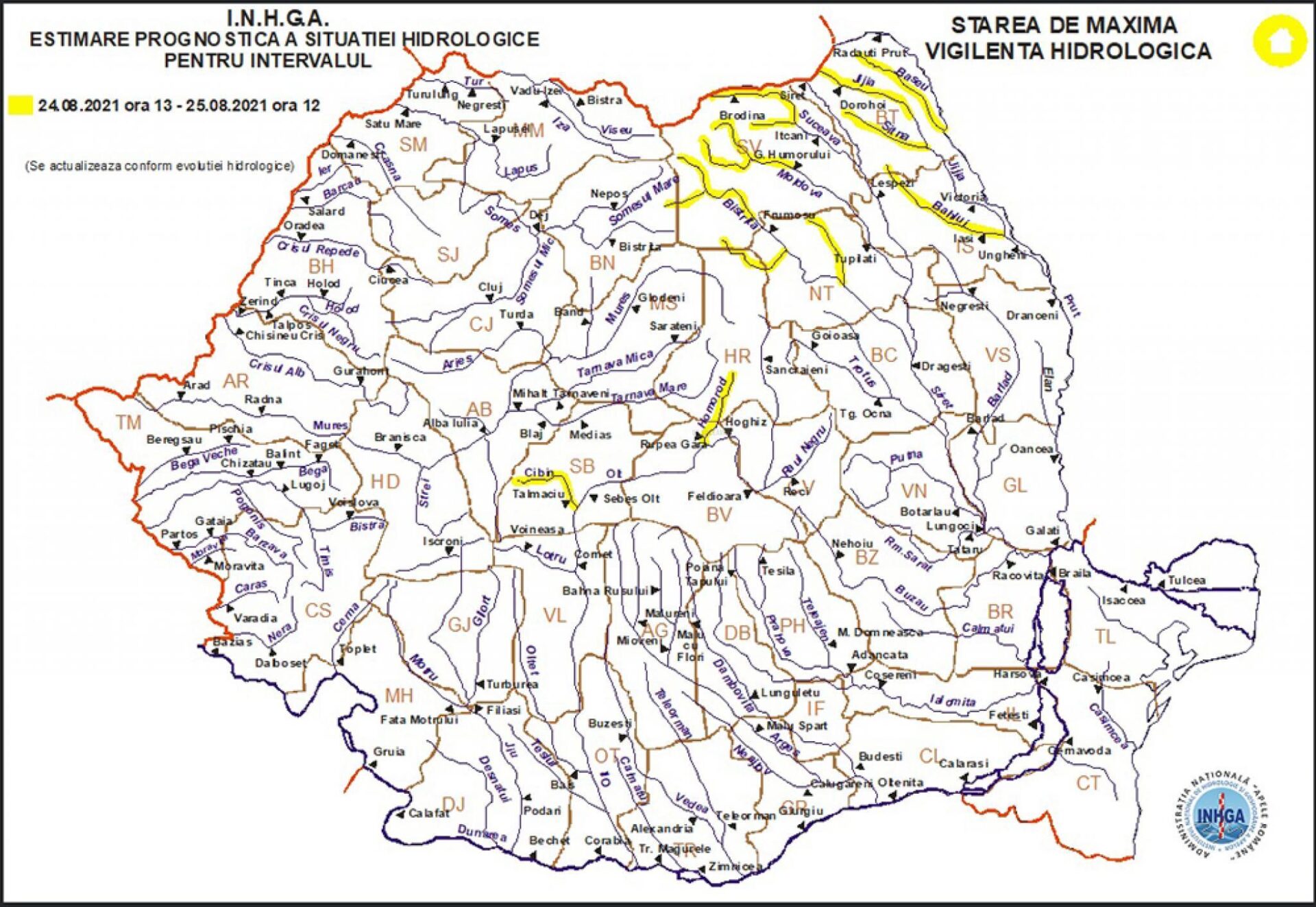În intervalul 24.08.2021 ora 13:00 – 25.08.2021 ora 12:00 pe râurile din bazinele hidrografice: