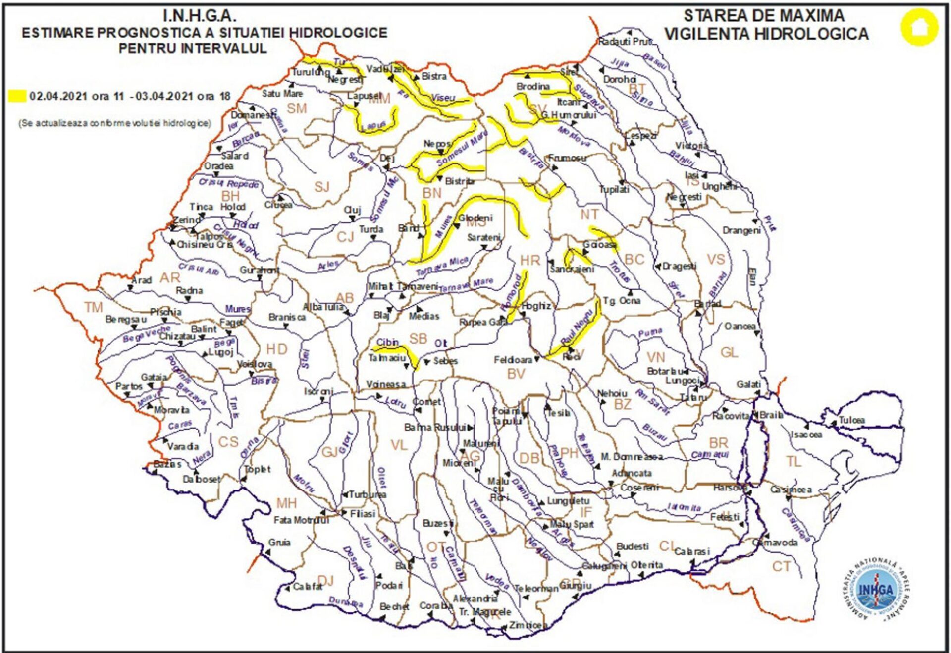 Codul galben este valabil în intervalul 02.04.2021 ora 11:00 – 03.04.2021 ora 12:00 pe râurile din bazinele hidrografice: