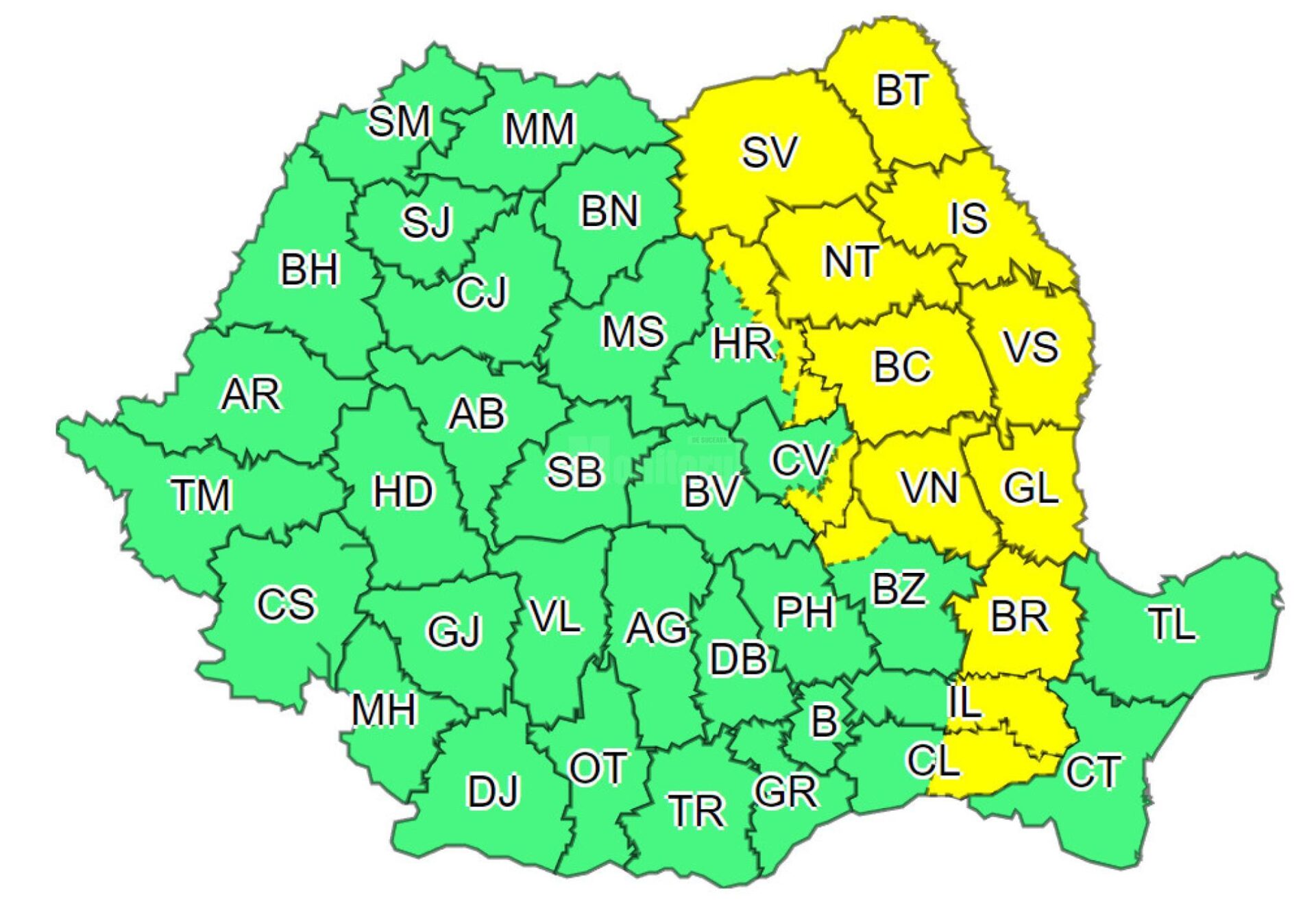 Administrația Națională de Meteorologie a emis miercuri dimineață o nouă atenționare, de tip cod galben de ninsori moderate cantitativ, polei și intensificări ale vântului, valabilă pâmă la ora 18.00, pentru județele Suceava, Botoșani, Neamț, Iași, Bacău, Vaslui, Vrancea, Galați, Brăila și parțial alte teritorii administrative.