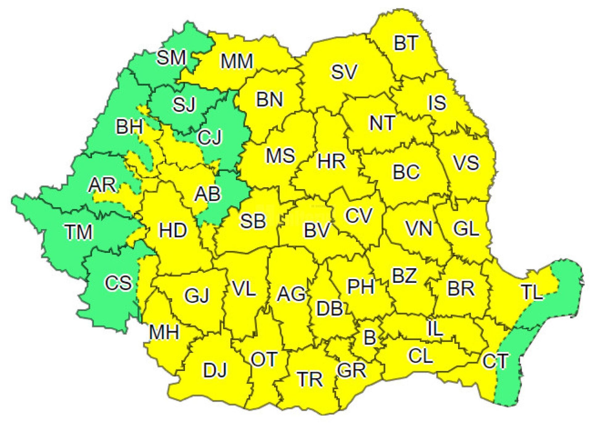 Codul galben vizează cea mai mare parte a țării, inclusiv județul Suceava.