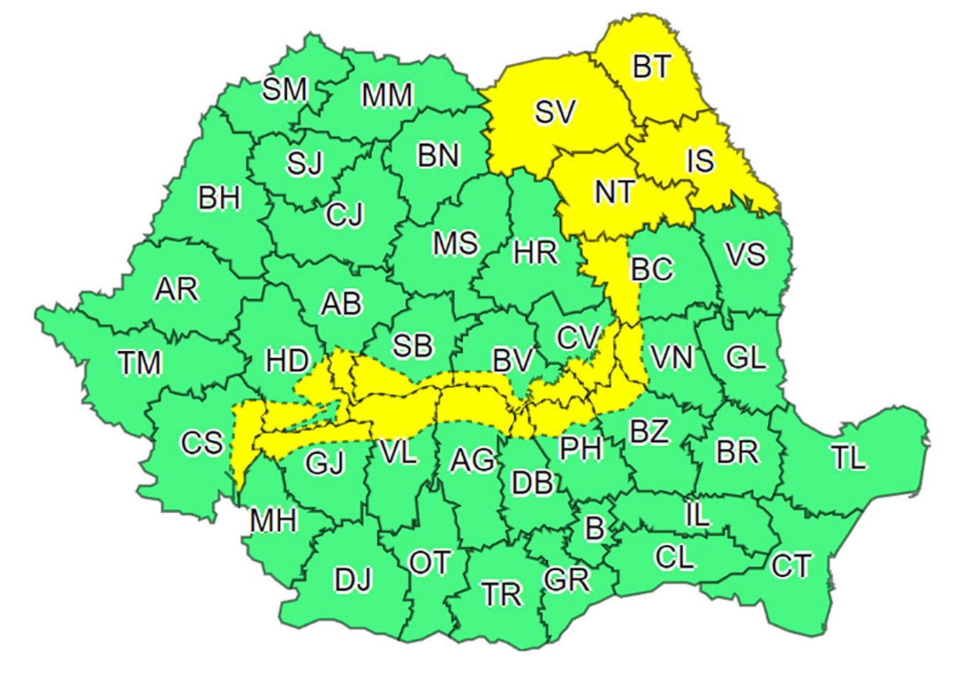 Codul galben este valabil în intervalul 13 ianuarie, ora 18.00 – 15 ianuarie, ora 20.00.