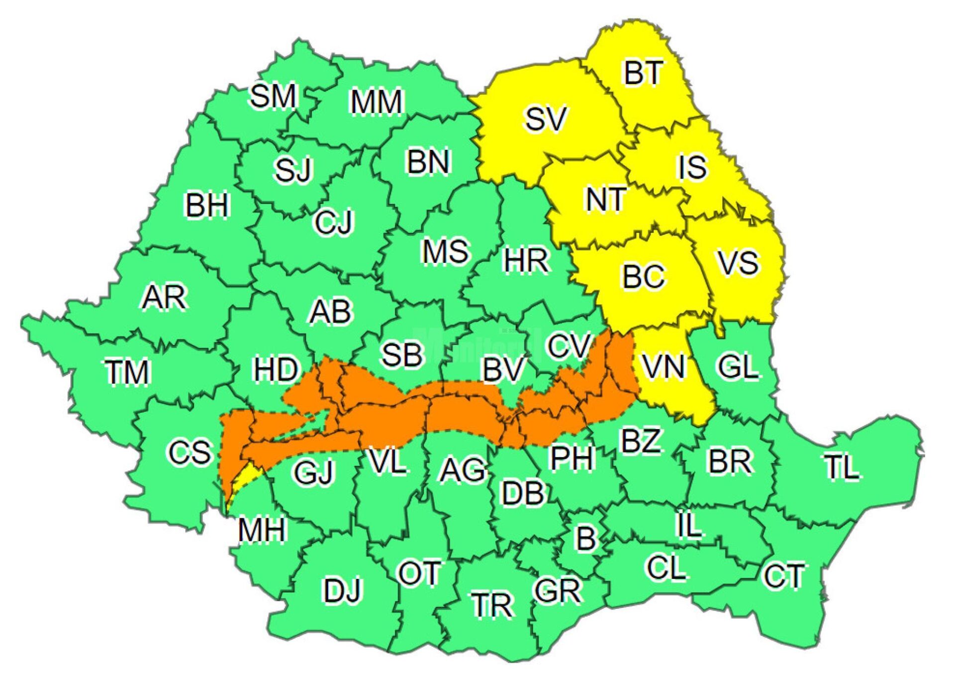 Administrația Națională de Meteorologie a emis vineri dimineață o nouă avertizare de tip cod galben de vânt puternic, valabilă în șapte județe, inclusiv Suceava, dar și una de tip cod portocaliu, pentru zonele înalte ale munților Carpați.