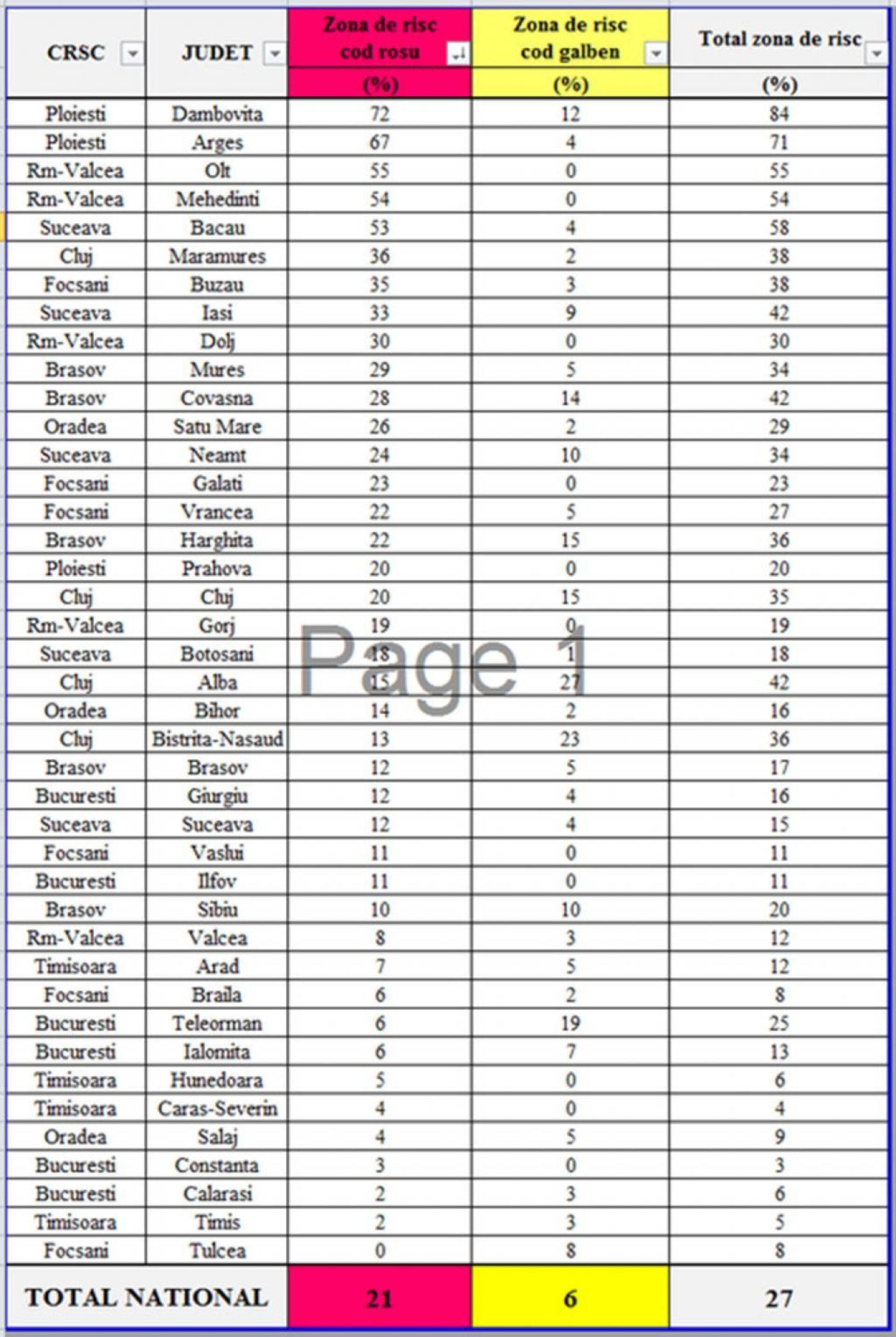 Astfel, dacă în județul Dâmbovița zona totală de risc (cod roșu și cod galben) este de 84% din suprafața împădurită, în Argeș – 71%, Bacău – 58%, în Olt – 55%, Mehedinți – 54%, pentru Suceava, zona totală de risc este de 15%, din care 12% este încadrată la cod roșu.