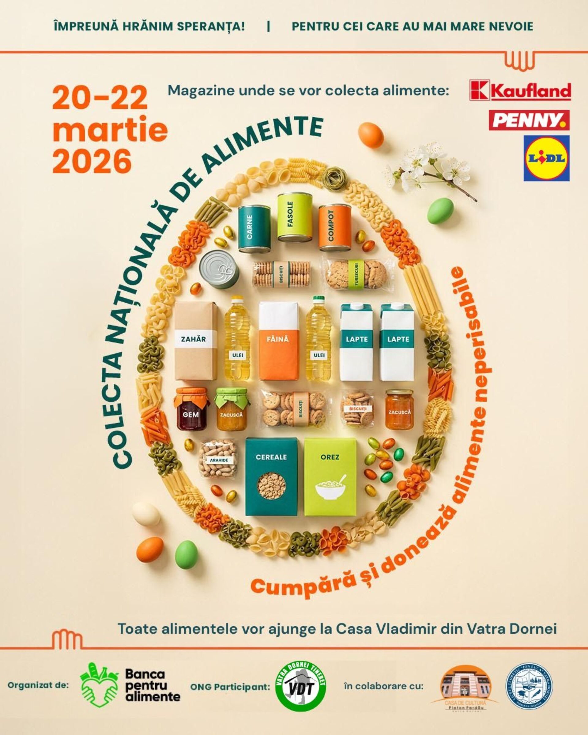 Banca Națională de Alimente, împreună cu Asociația Vatra Dornei Tineret (VDT), Casa de Cultură „Platon Pardău” și Liceul Teoretic „Ion Luca” organizează, în perioada 20 – 22 martie 2026, în intervalul 09:00 – 21:00, la Kaufland, Penny și Lidl Vatra Dornei, o colectă de alimente pentru copiii de la Casa Vladimir din municipiu.